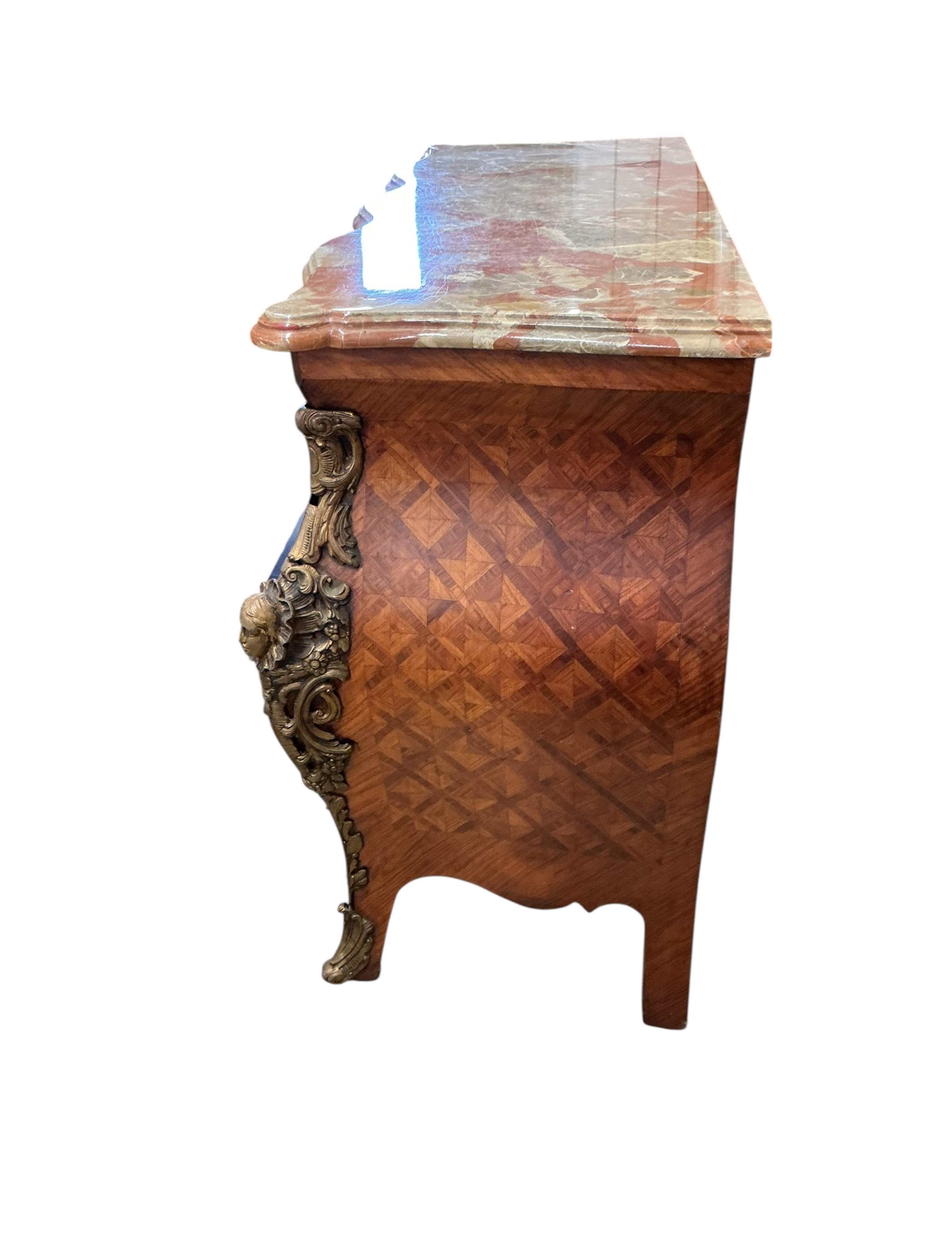 Lot 1258 , A French transitional style gilt metal mounted kingwood parquetry marble top commode, width 122cm, depth 48cm, height 89cm