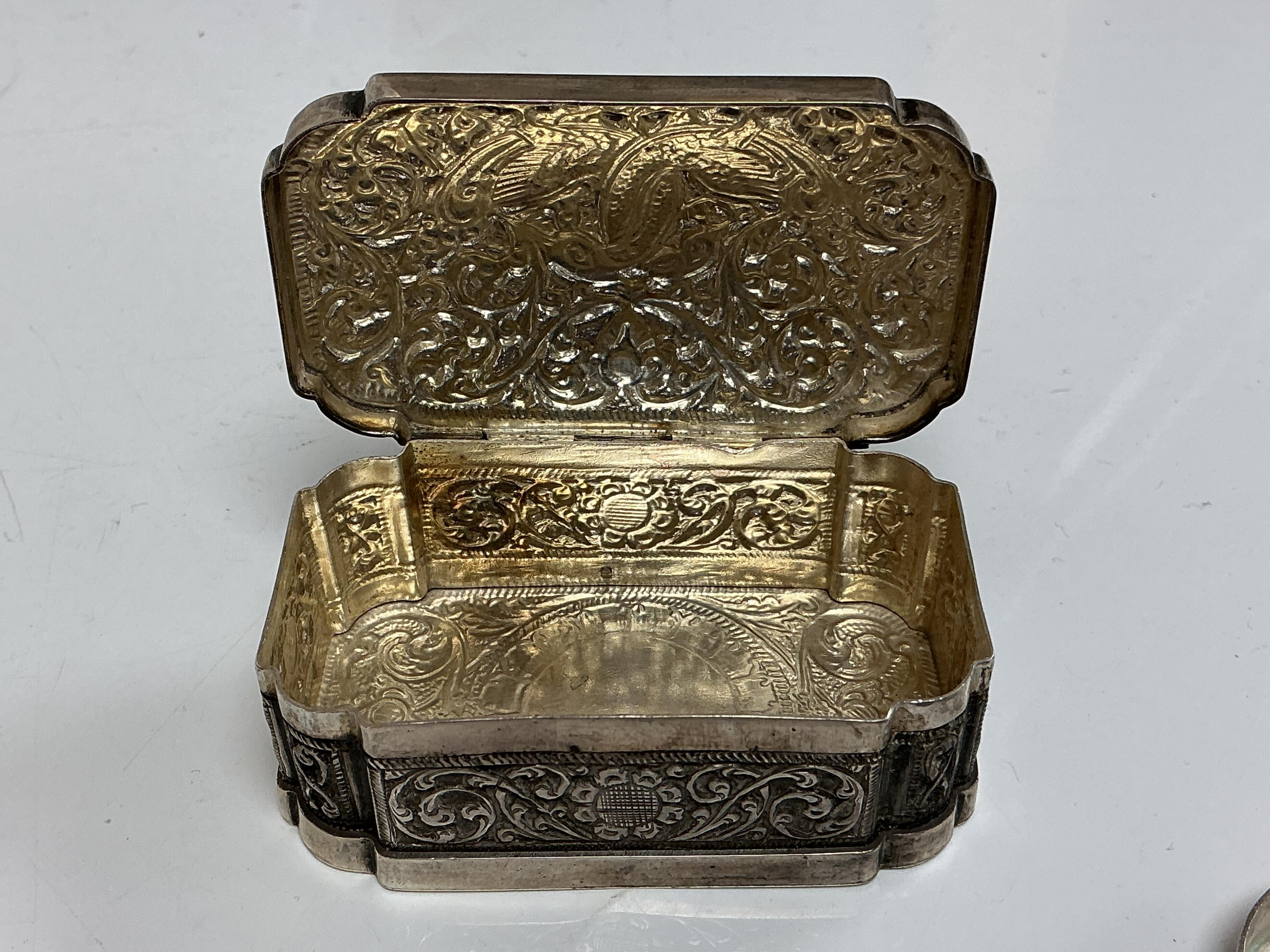 Lot 1832 , An early to mid 20th century Indian embossed white metal shaped rectangular snuff box, 71mm, together with a similar circular pill box, stamped KAA.