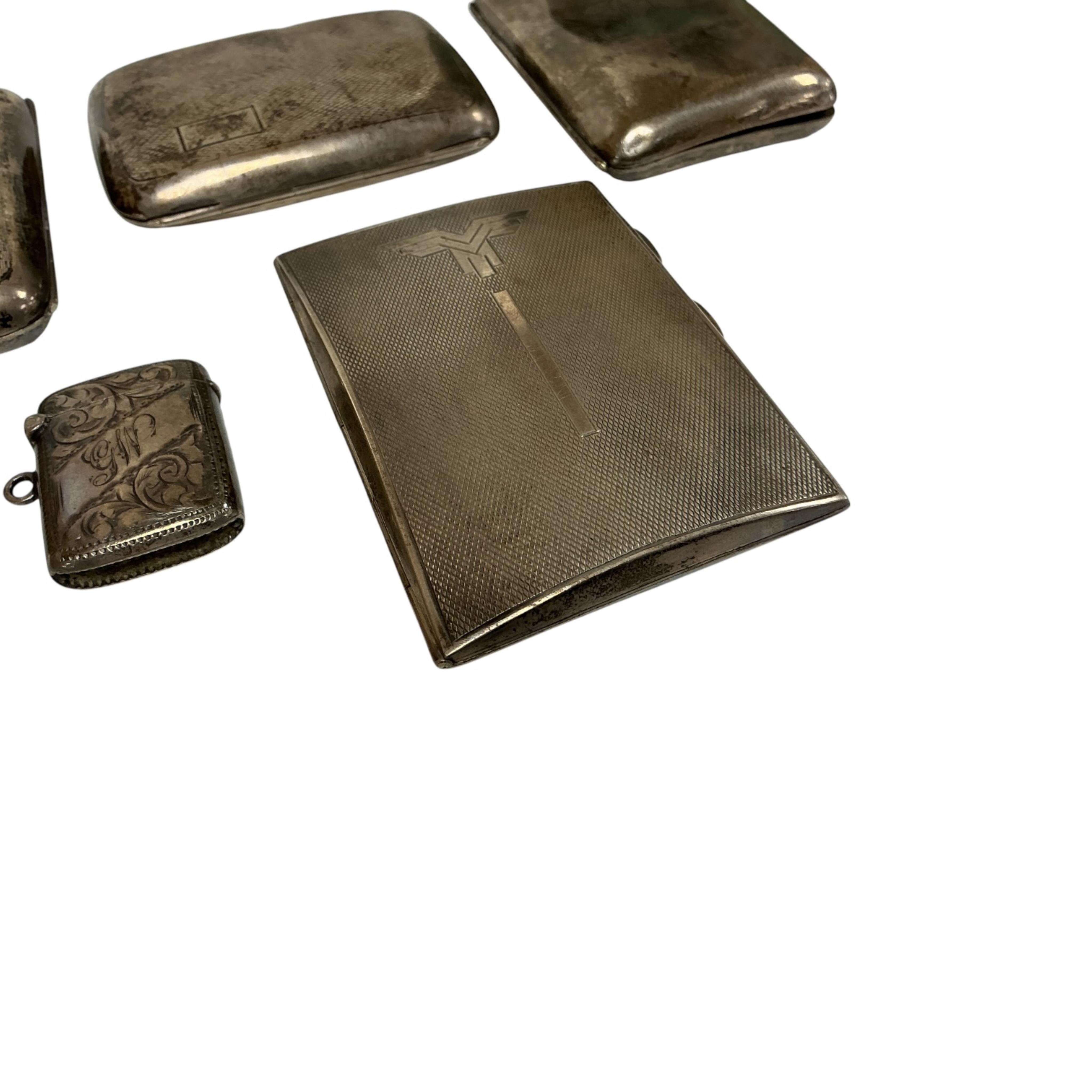 Lot 1831 , Four assorted silver cigarette cases including an Art Deco engine turned rectangular case by W.J. Myatt & Co, Birmingham, 1933, 84mm, together with a silver vesta case, gross 9.8oz.