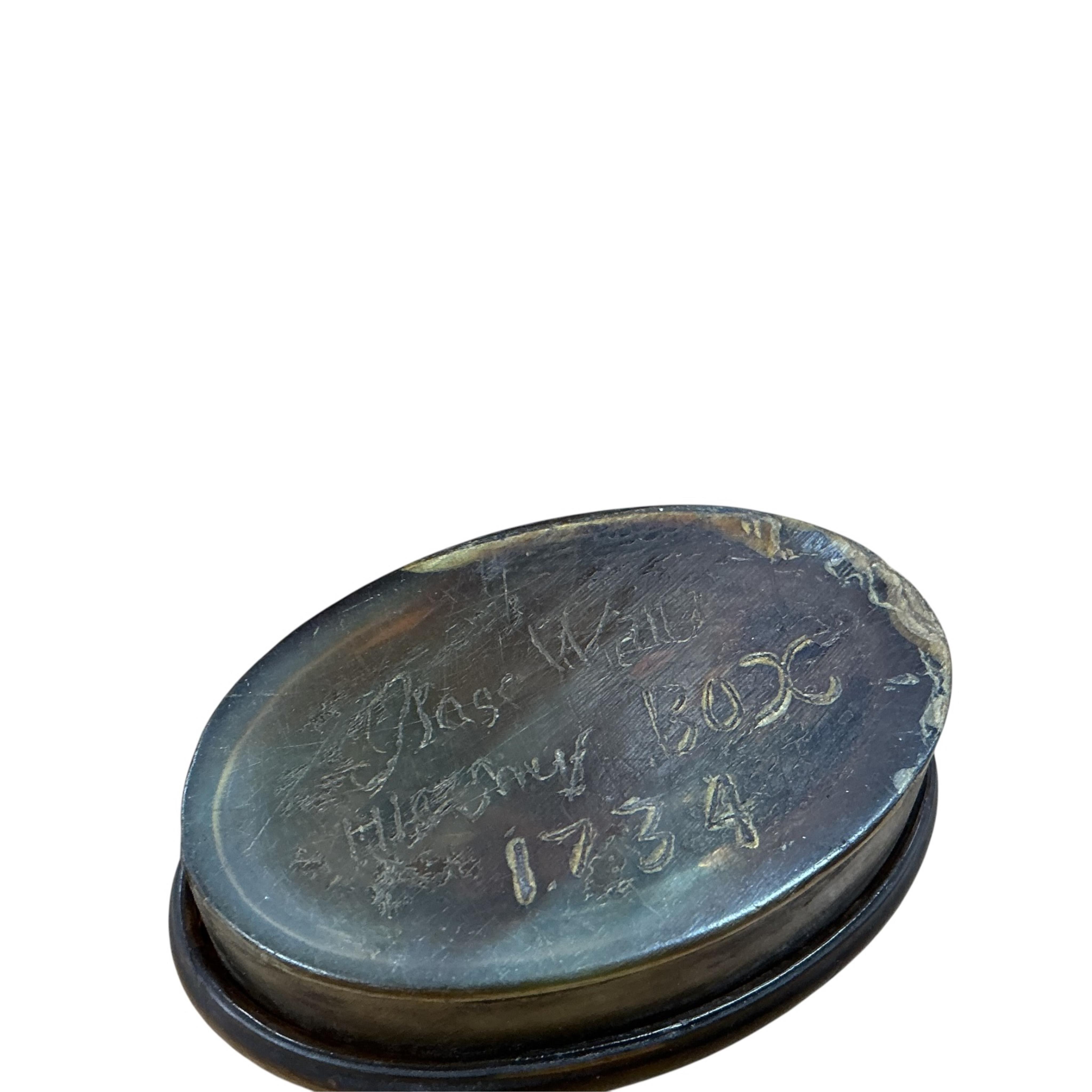 A oval tortoiseshell snuff box with stylised decoration, incised dated 1734 to the base, 6.5cm wide