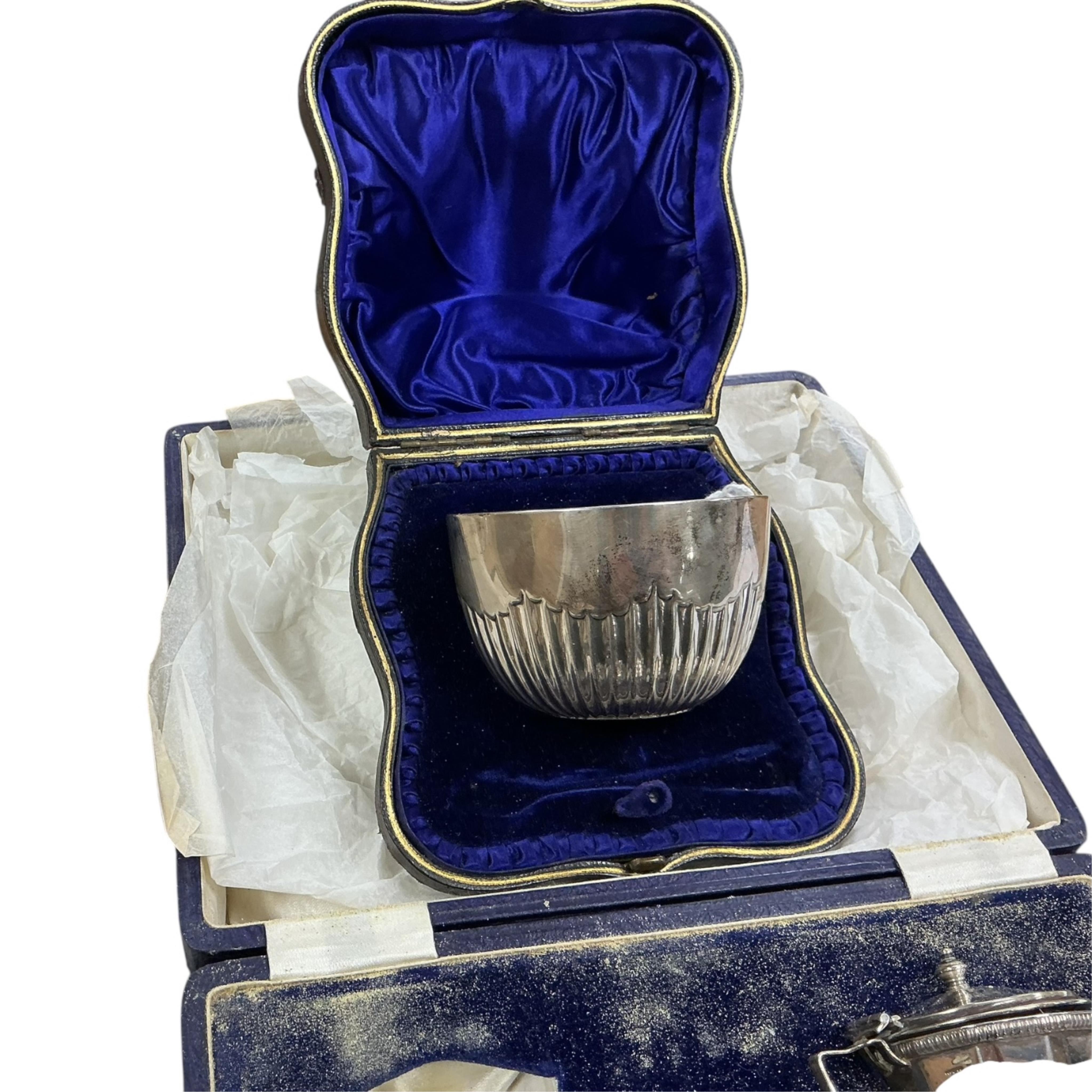 Lot 1860 , A cased Edwardian silver sugar bowl, Josiah Williams & Co, London, 1901 a cased part silver cruet set, plated spoons and a silver mounted glass sugar caster.