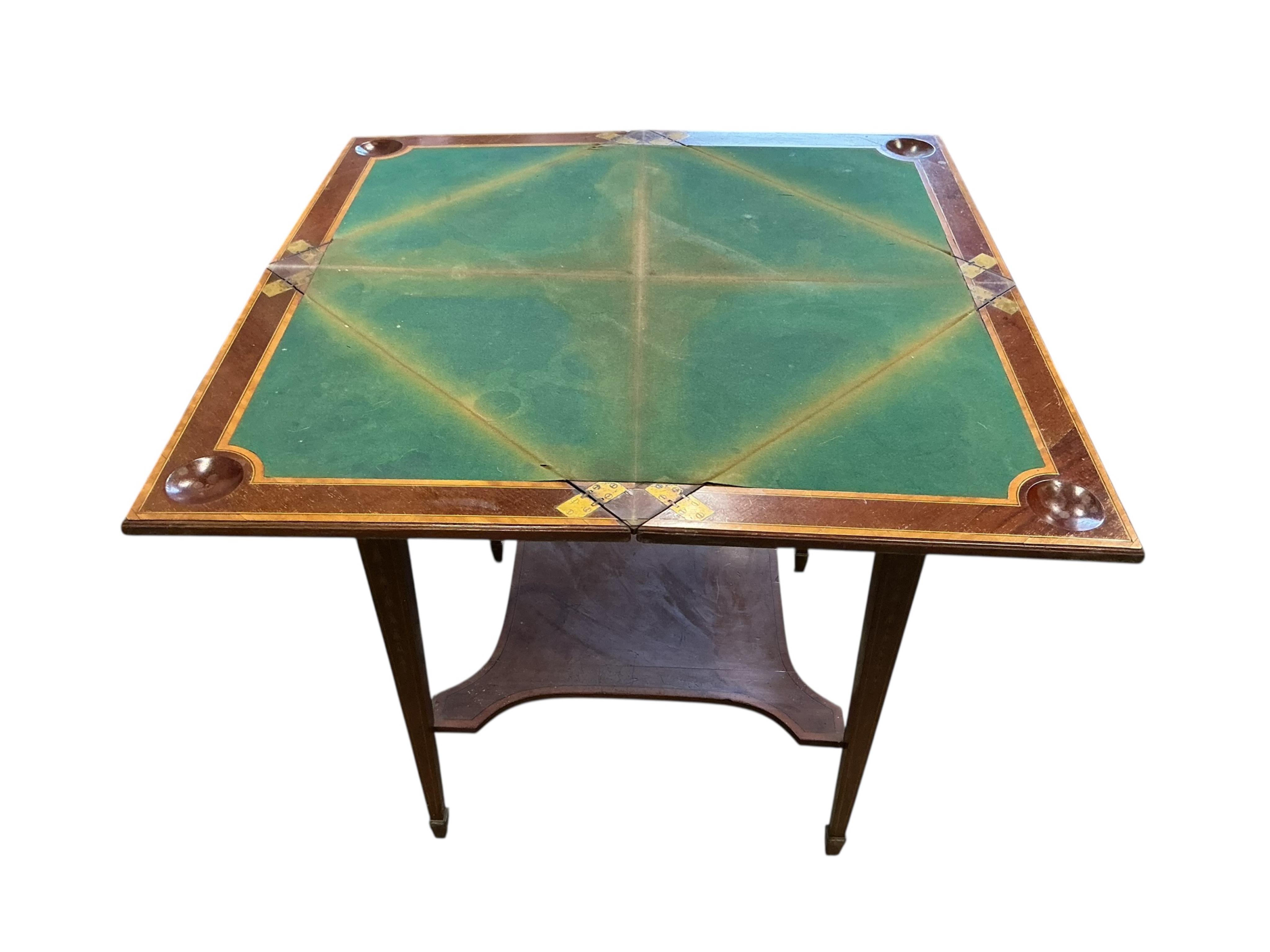 Lot 1336 , An Edwardian marquetry inlaid mahogany envelope card table, width 61cm, depth 61cm, height 74cm