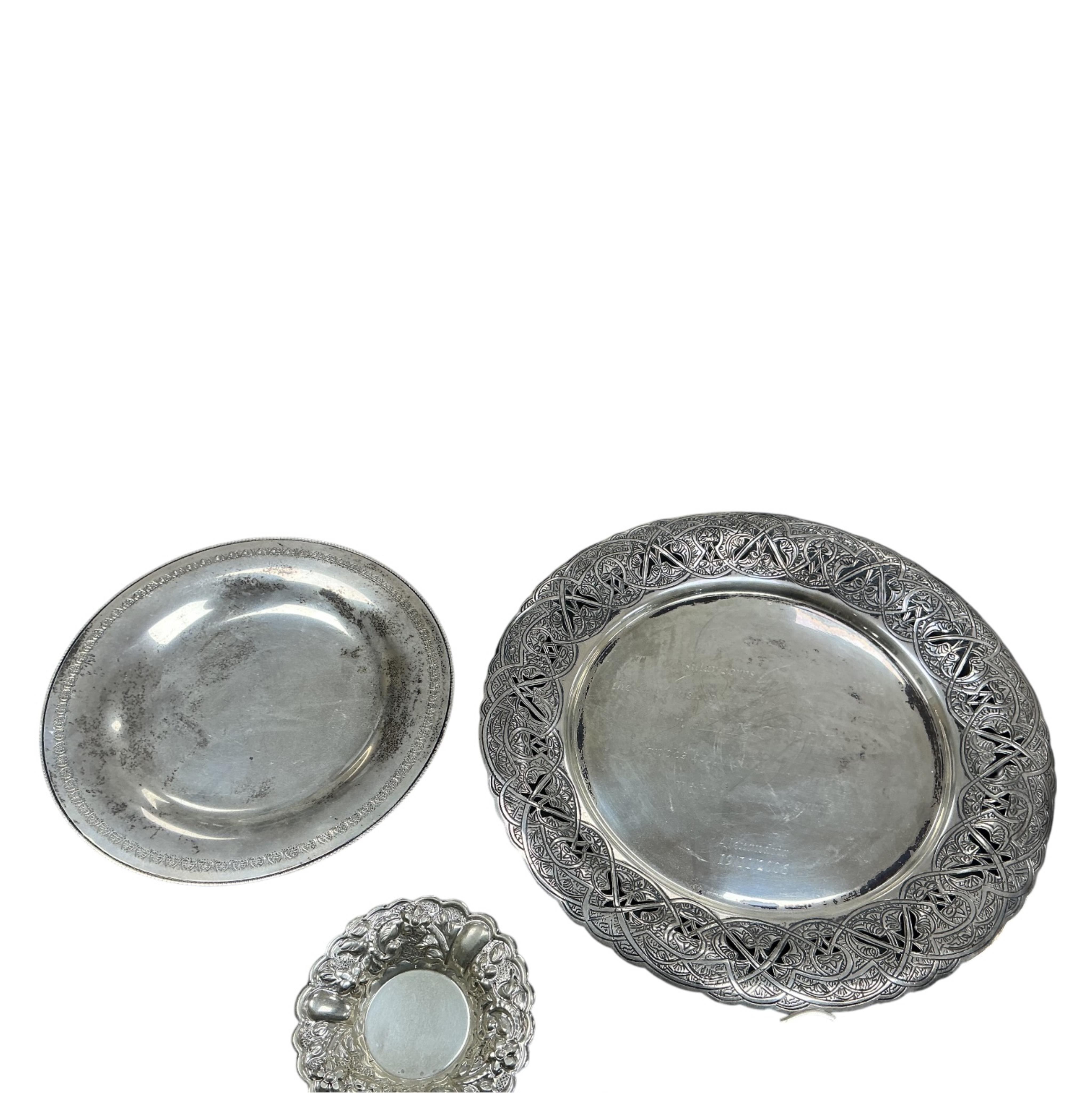 Lot 843 , Two recent Egyptian white metal circular dishes, with pierced borders and engraved inscriptions, largest diameter 24cm, together with three smaller Egyptian white metal dishes and a Middle Eastern white metal dish with e