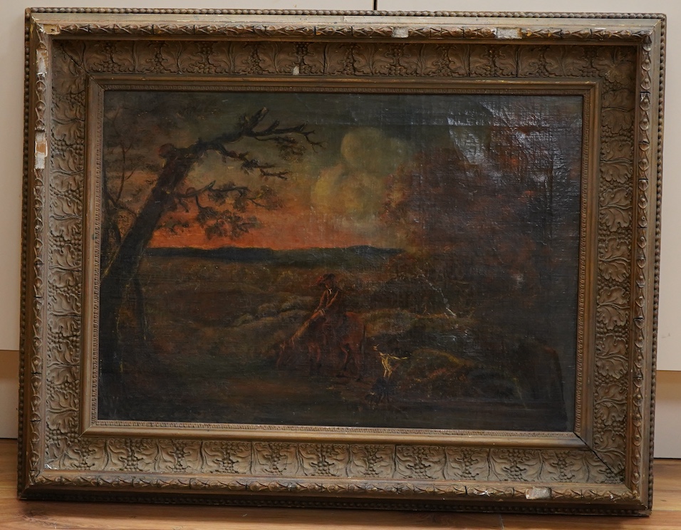 Follower of Thomas Creswick RA (1811-1869), pastoral landscape with a figure on horseback and two dogs, signed ‘T. Creswick’ lower right, oil on canvas, 39 x 56cm