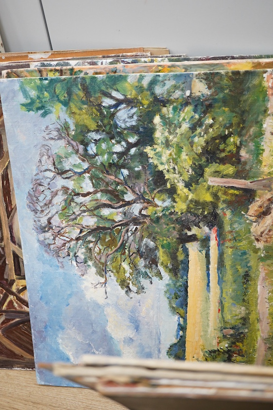 A collection of approximately eighteen oil paintings by B. Leney, (based in Kingston, Sussex), to include local landscapes, a still life of fruit & vessels and a Venetian canal, many signed, unframed, largest work on canvas, 46 x 61cm
