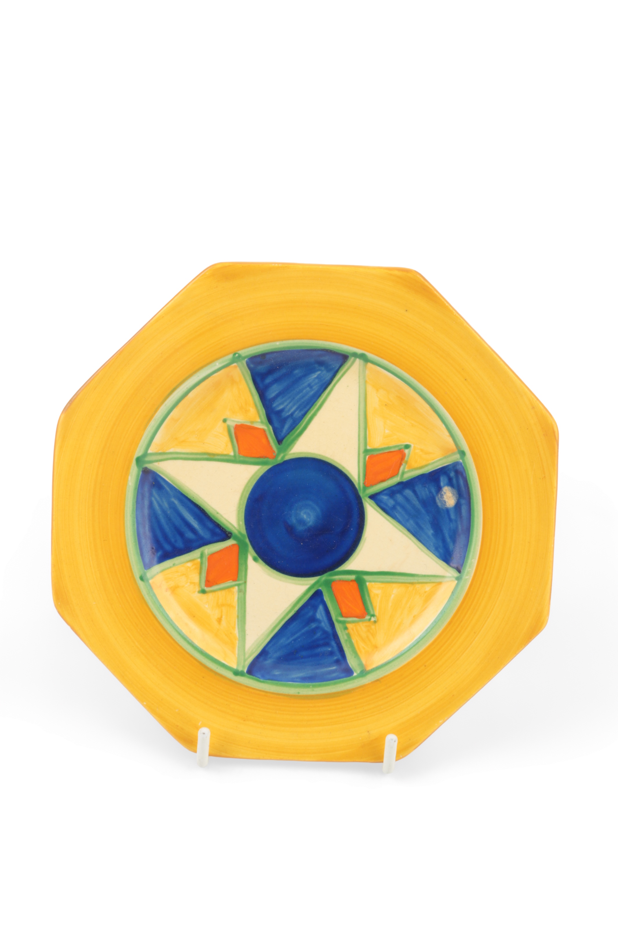 Lot 261 , Clarice Cliff: A Sungold plate and Sunburst side plate, 25cm diameter and a smaller Bizarre octagonal side plate