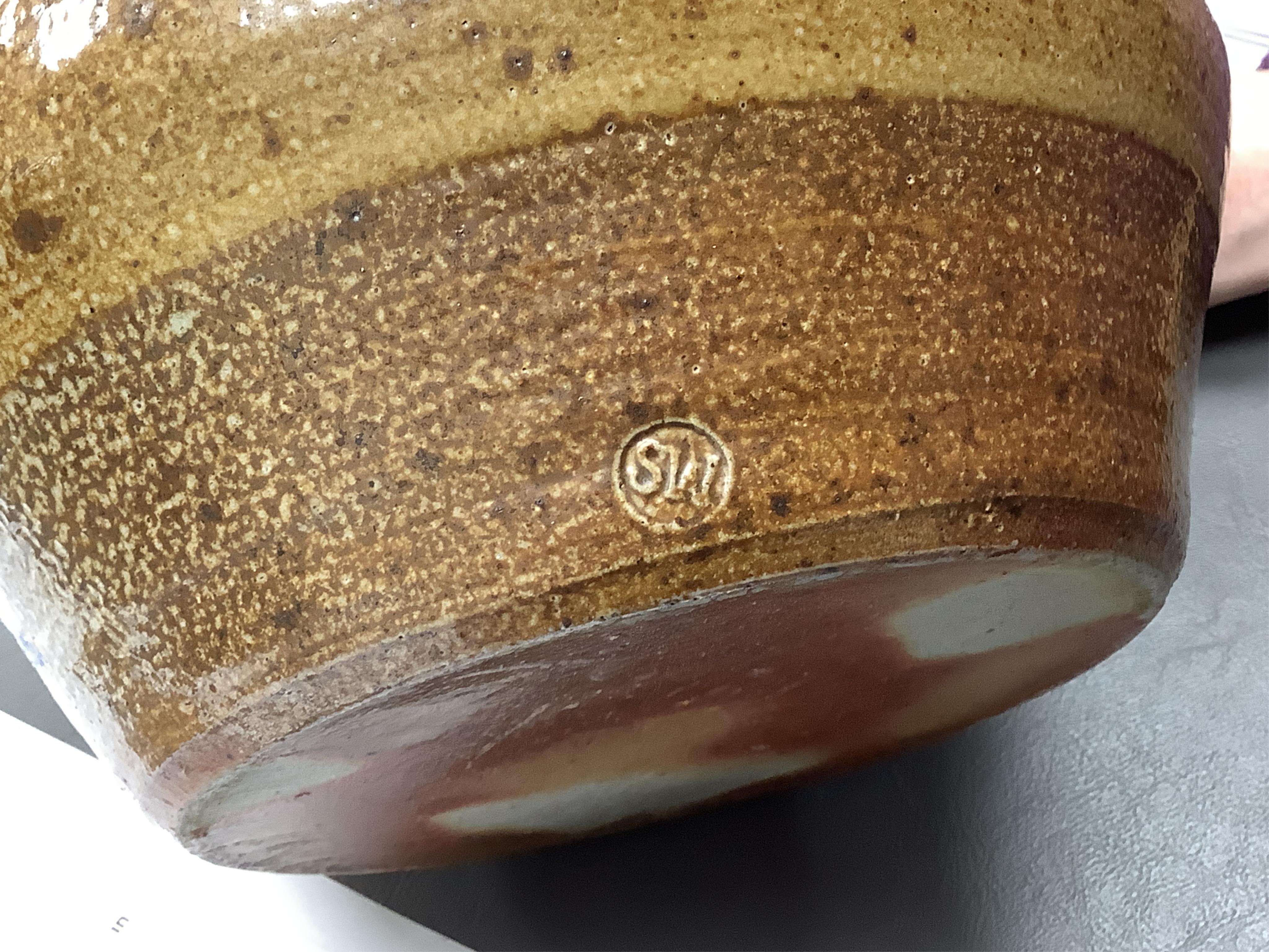 Lot 3147 , A Sarah Walton (b.1945) salt glazed studio pottery teapot and cover with bamboo swing handle, height 27cm.