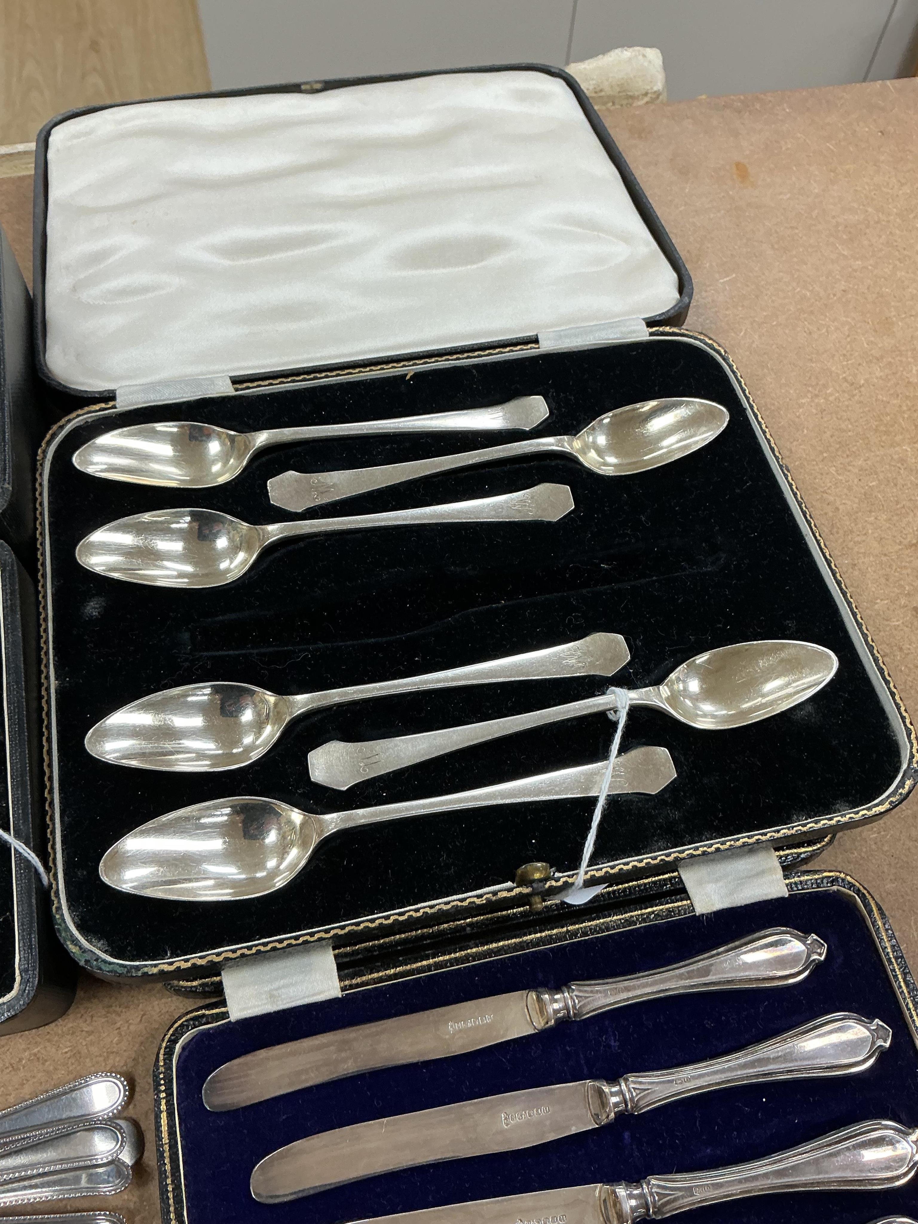 A cased George V silver christening mug by Deakin & Francis, Birmingham, 1931, a pair of late Victorian silver pedestal salts, six silver grapefruits spoons and a cased set of silver handled tea knives and a quantity of other sundry small flatware etc.
