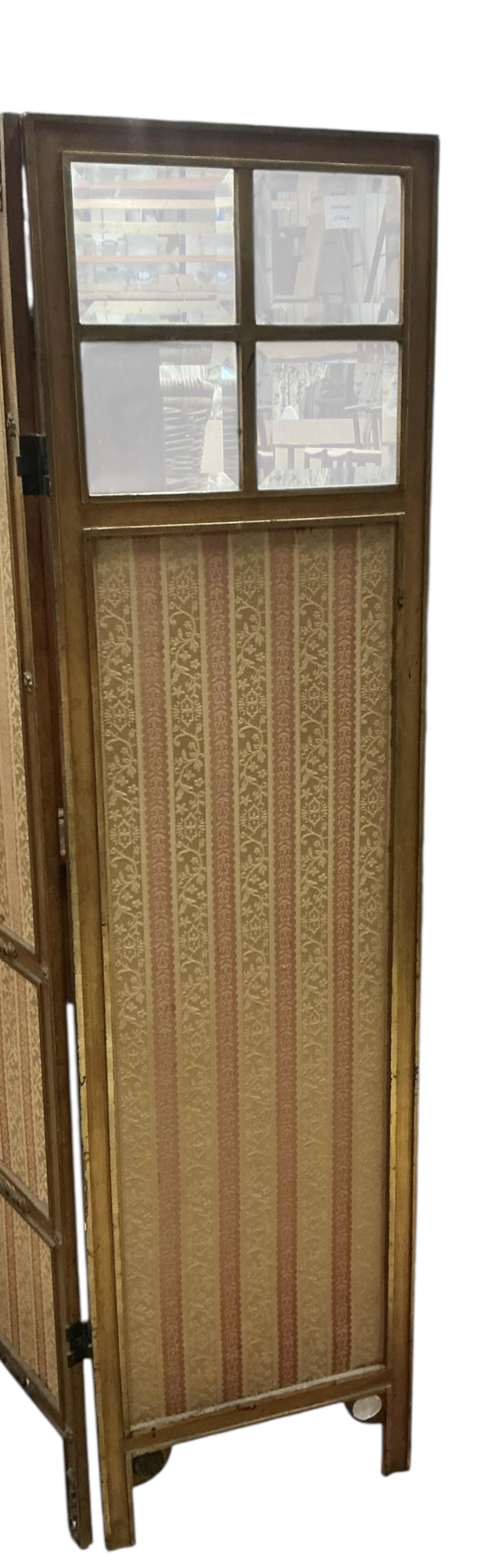 A late 19th century glazed giltwood three fold dressing screen, each panel width 45cm, height 184cm