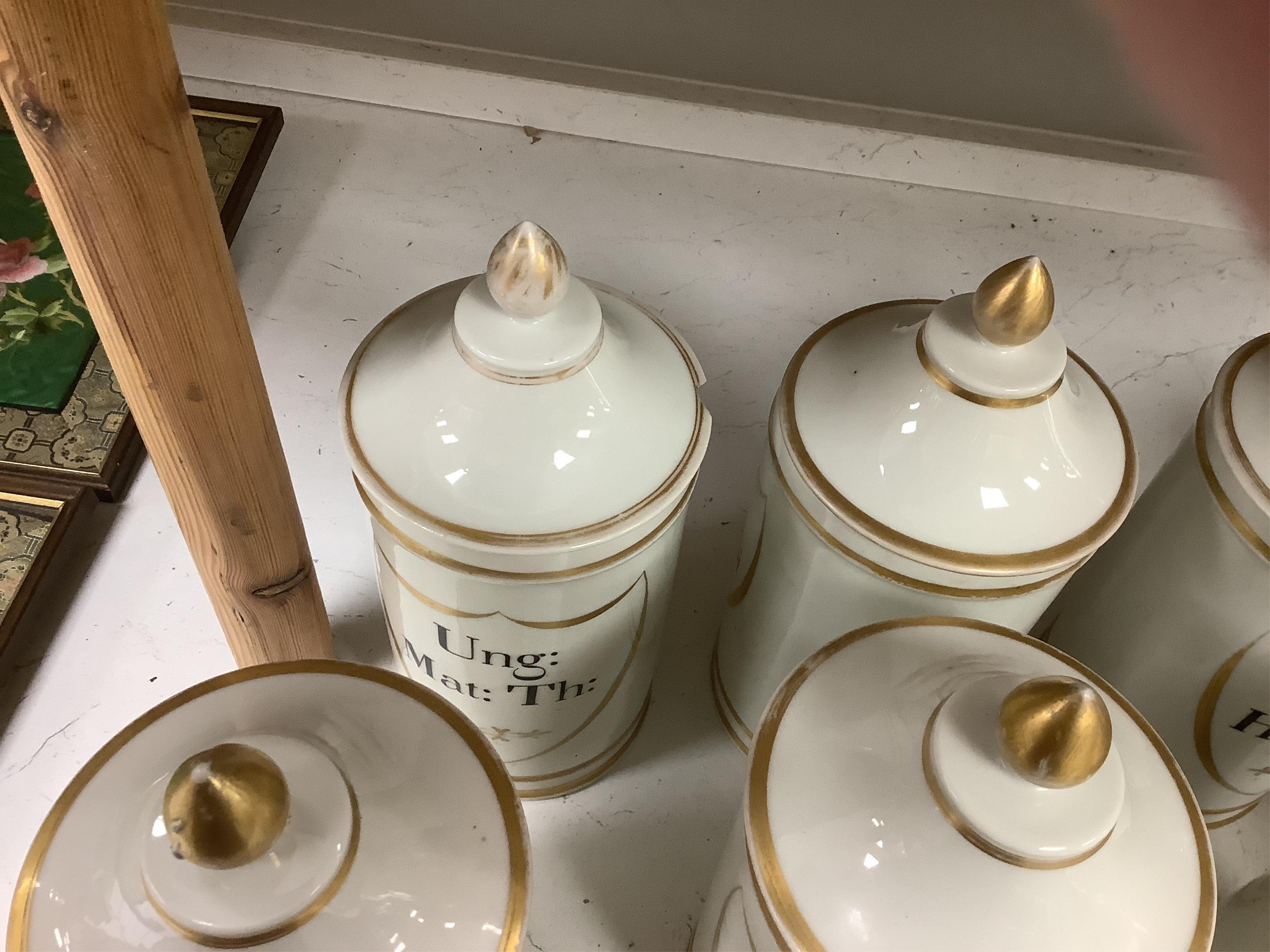 Lot 1302 , A set of eight 19th century French porcelain pharmacy jars and covers and three similar smaller jars, largest each 29cm high
