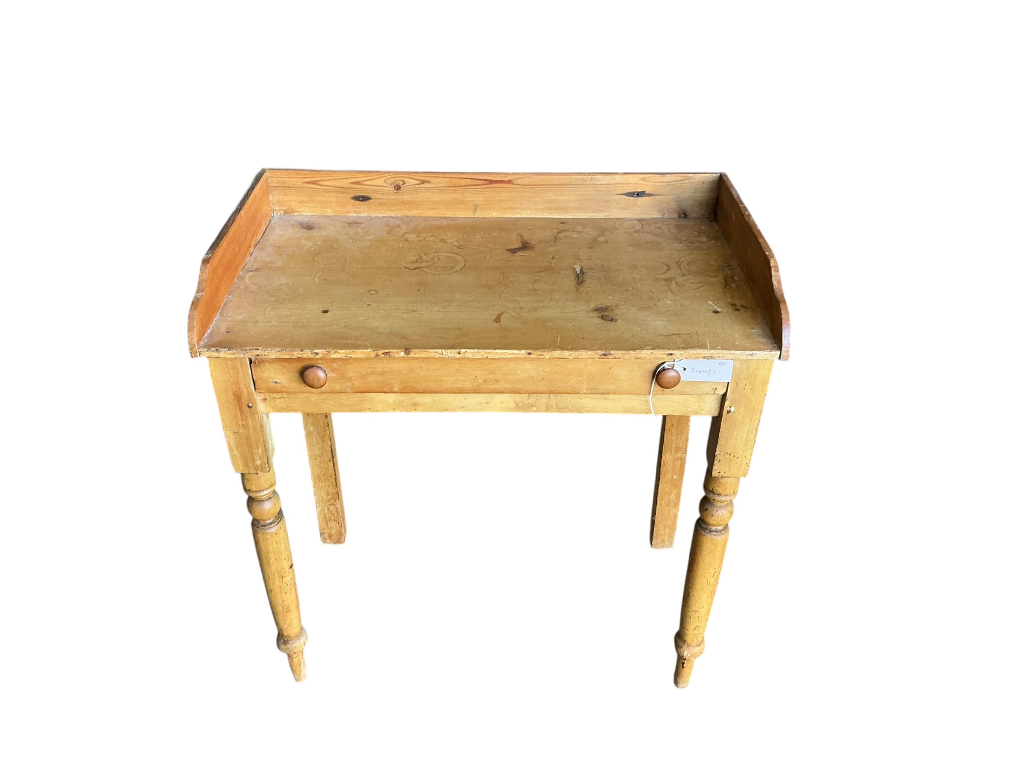Lot 1123 , A pine shove ha'penny table, width 121cm, depth 60cm, height 61cm and a Victorian pine washstand, width 73cm, depth 41cm, height 80cm