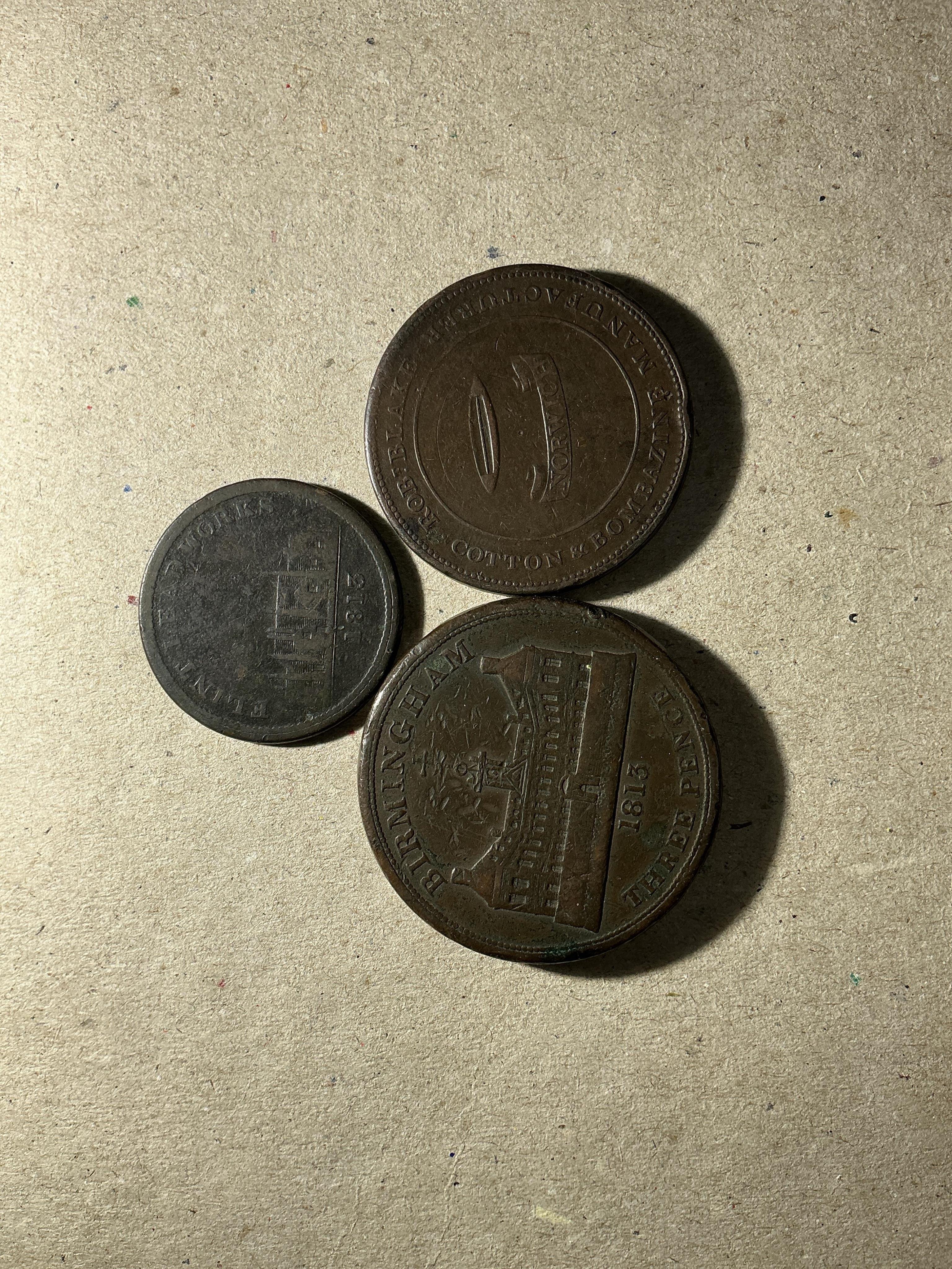 Comprising ten, one penny tokens, a Norwich twopence token and a Birmingham threepence token