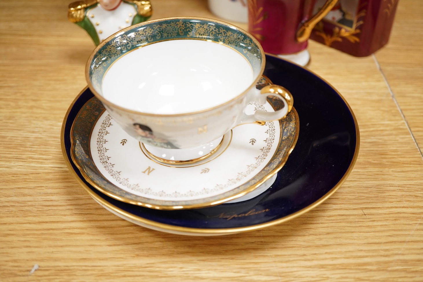 Napoleon interest , a group of commemorative ceramics including a Sitzendorf figure, height 17cm, two Limoges jugs and flask etc (10)