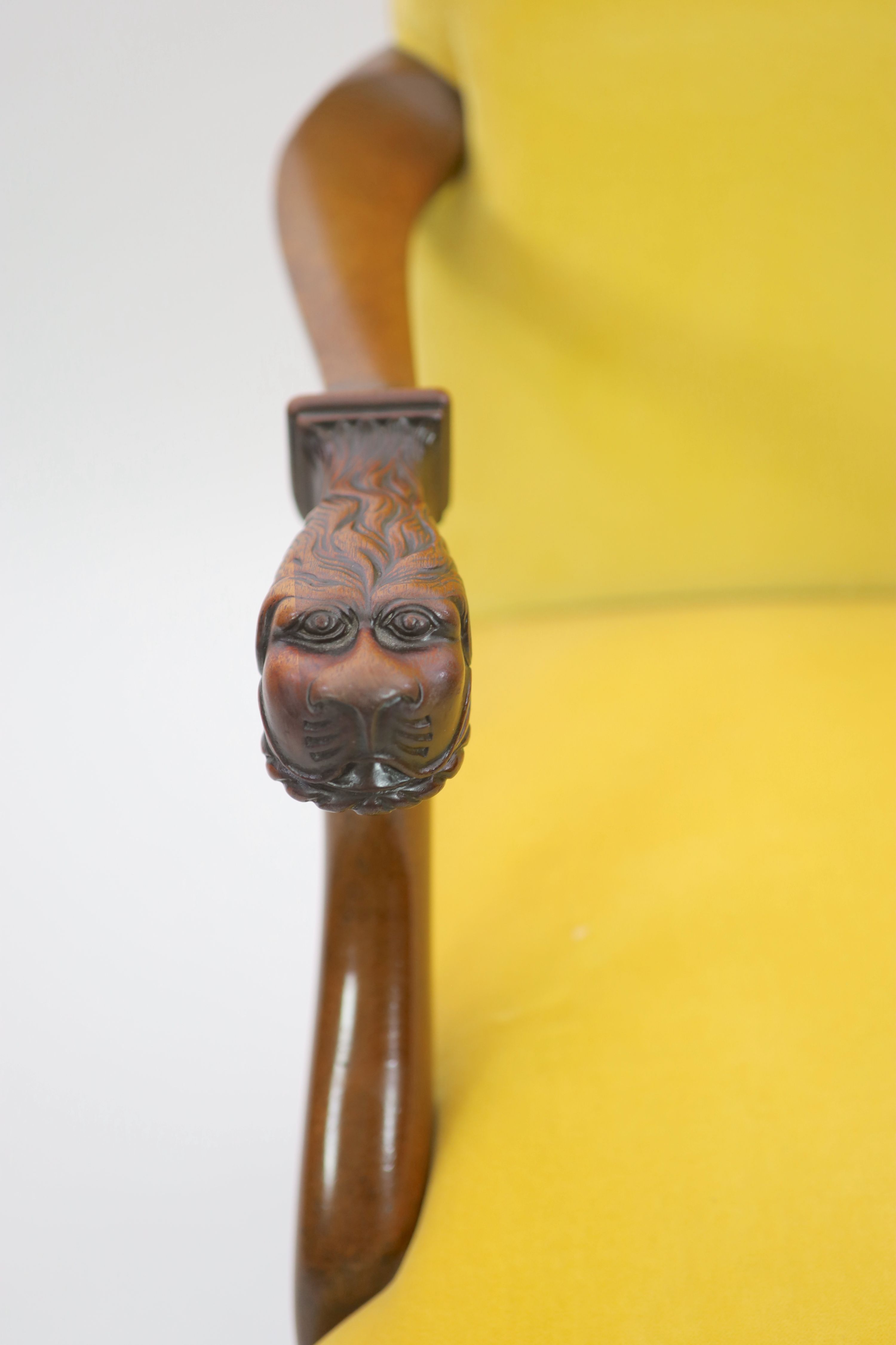 with yellow fabric upholstered backs and seats, and lion head carved arm terminals, on mask kneed cabriole legs with lion's paw feet,