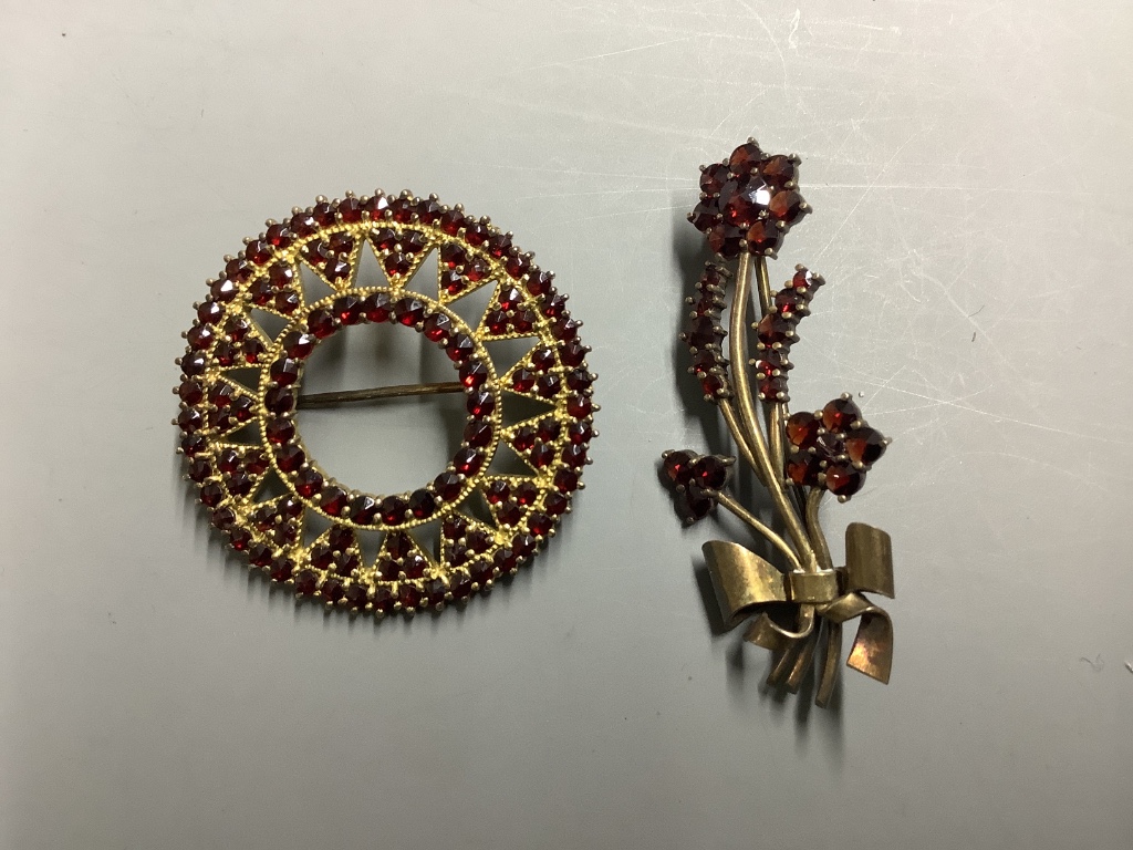 A group of facetted garnet set jewellery, including brooches, pendants and ear studs,