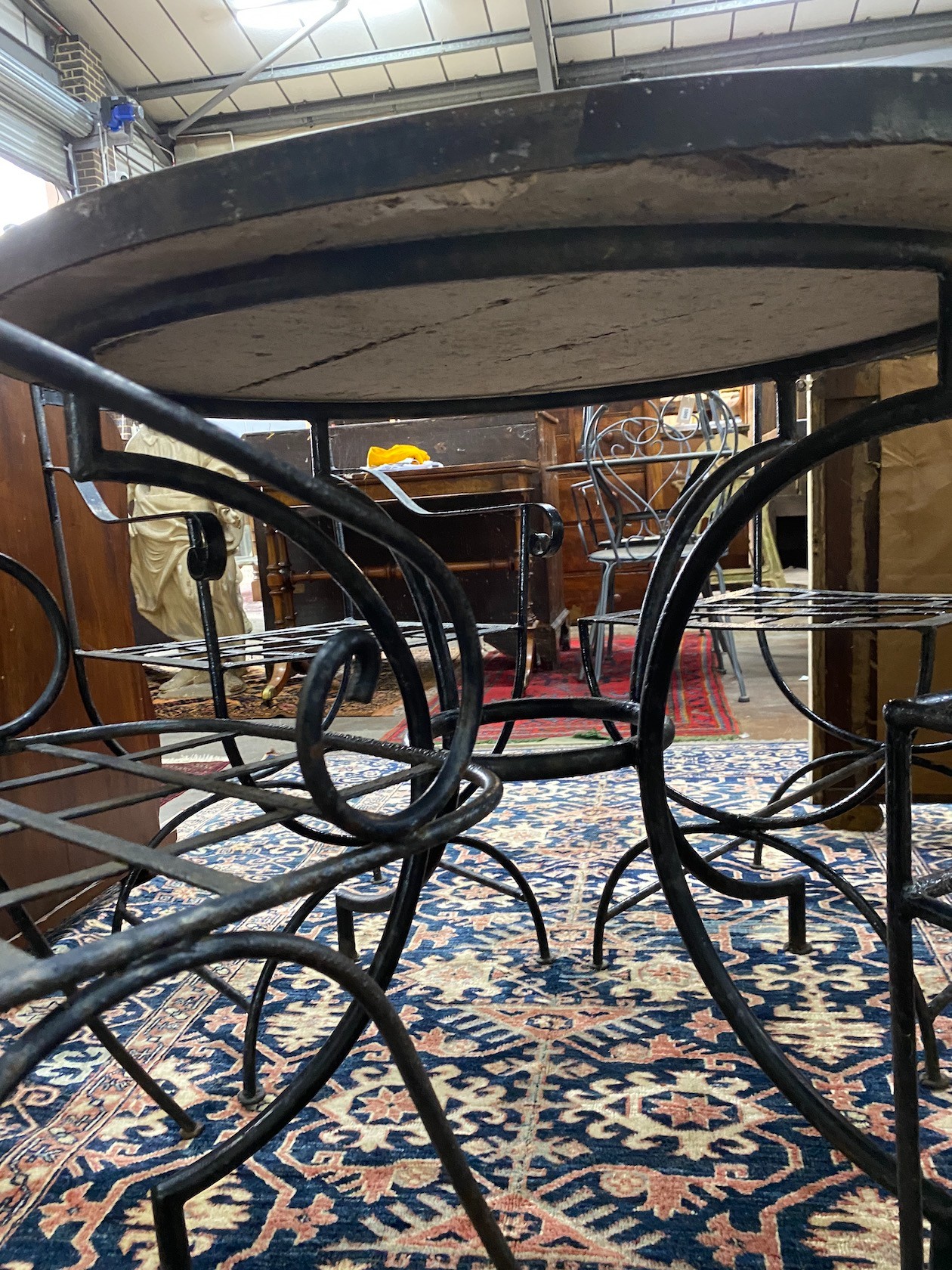 Lot 1089 , A circular mosaic top wrought iron garden table, diameter 100cm, height 74cm together with four wrought iron garden chairs, two with arms