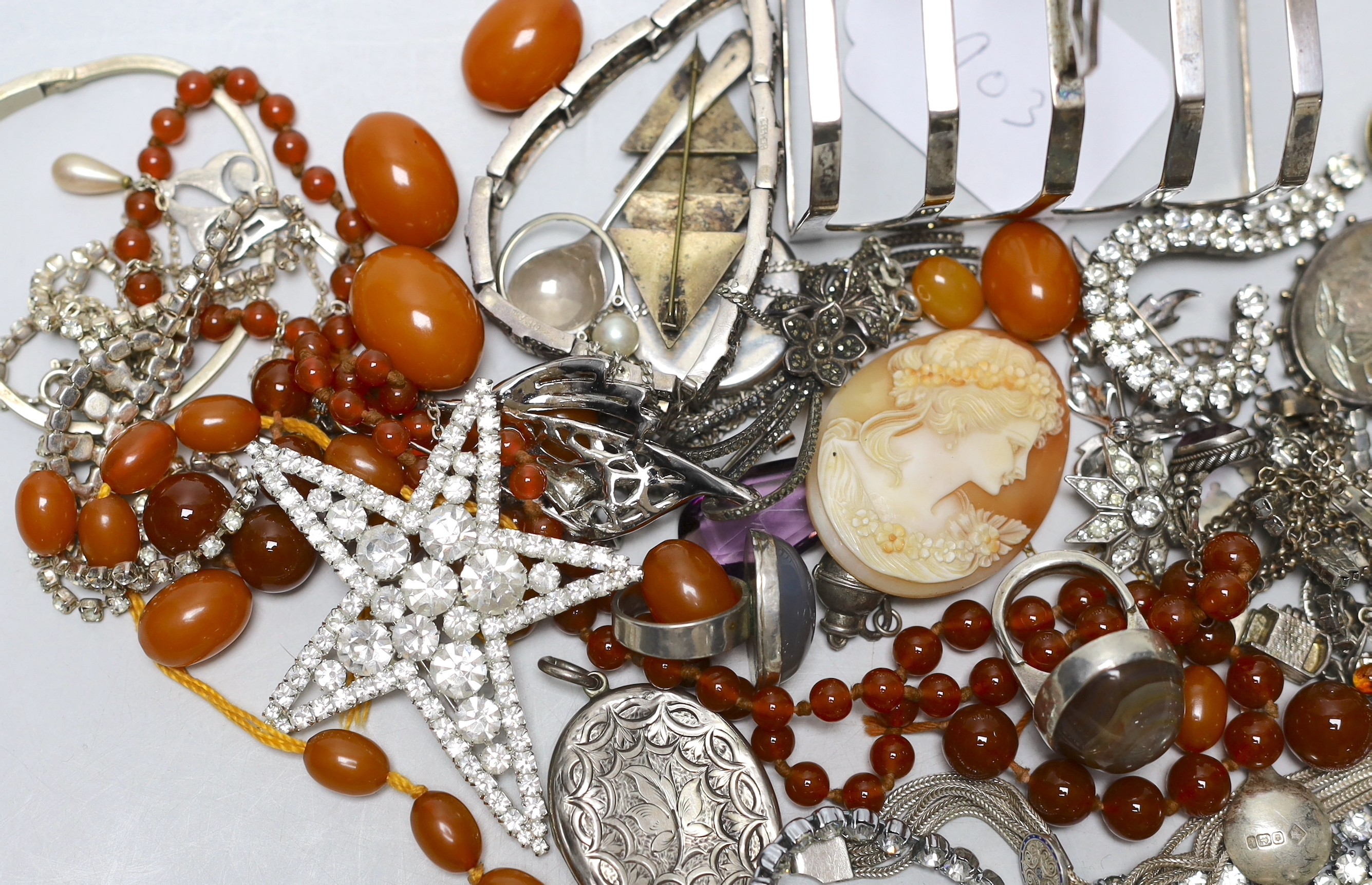 Mixed costume jewellery including a silver, marcasite and moonstone set flower brooch, faux amber beads, etc. and a silver five bar toast rack.