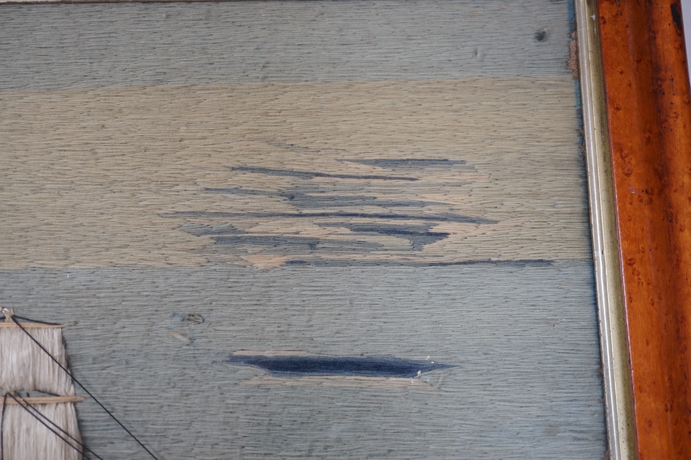 Some wear to threads at top right and lower right corners, at edges; oval stain to lowest fore-sail; three small pieces of brown paper from the backing have found their way onto the centre and aft-sail, not serious. Picture is loose in its frame, which is almost certainly original. Frame lower right edge cracked, not serious.