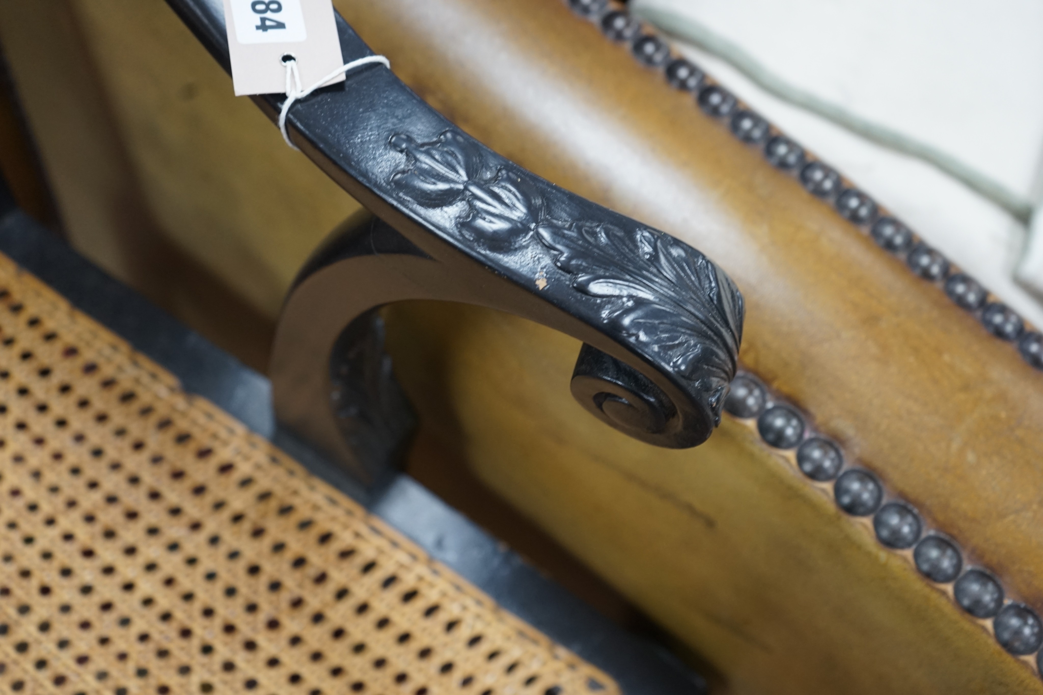Lot 184 , An 18th century style ebonised caned Irish elbow chair, width 70cm, depth 46cm, height 107cm (top rail requires restoration)