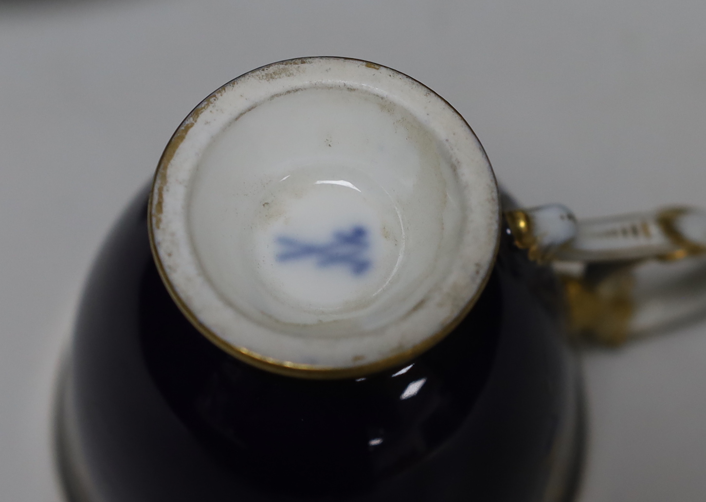 Coffee pot neckrim with deep chip, approx. 5x3mm; one cup with large, unsightly glue-repair around handle; one saucer similarly repaired; others good. All with crossed swords marks in underglaze blue.