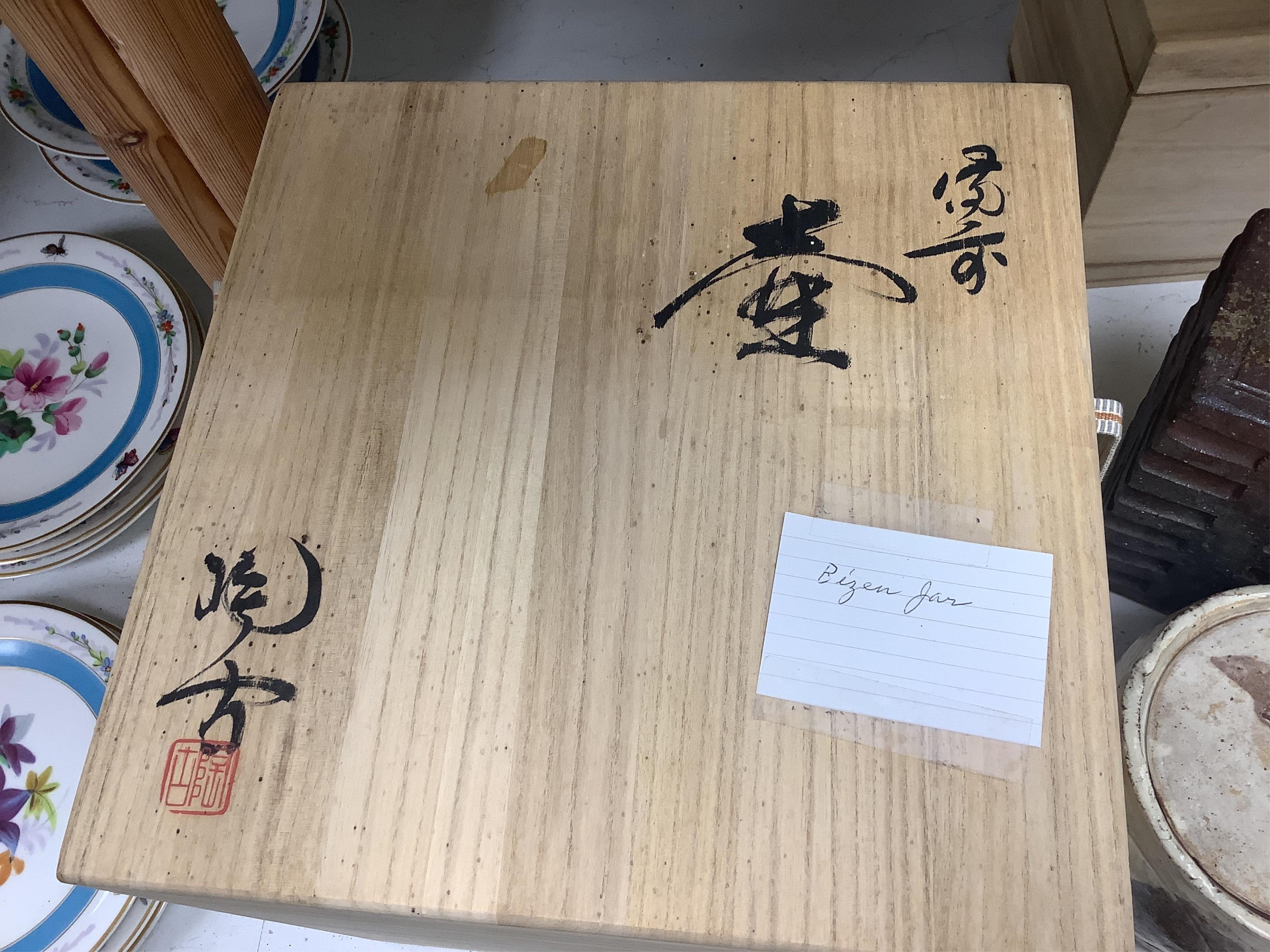 Three Japanese pottery vases and a similar pot and cover, Bizen kilns etc.,two items boxed, largest 25.5cm high