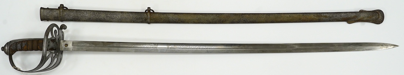 Lot 1291 , An 1827 pattern Victorian Rifle Officer’s sword, the blade etched with crowned VR and bugle, regulation hilt and scabbard, blade 82.5cm. Condition - poor