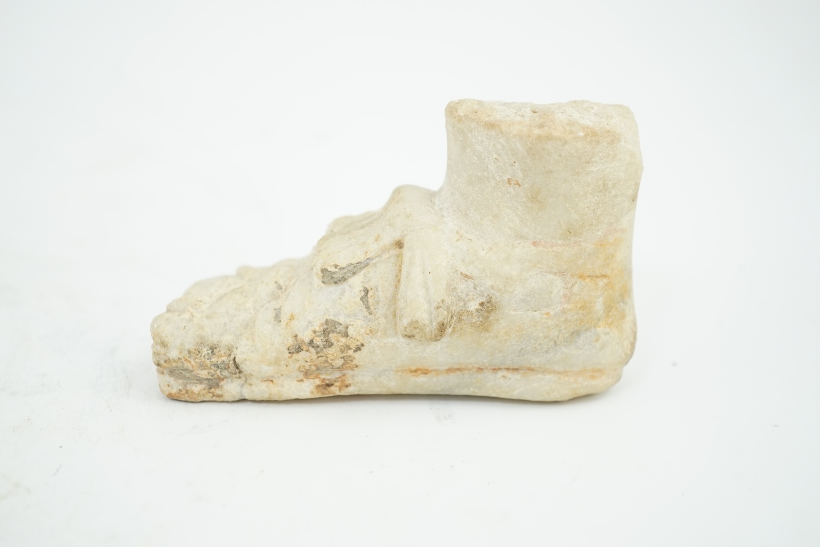 A Roman carved marble model of a sandalled foot, 10cm long, 5.75cm high