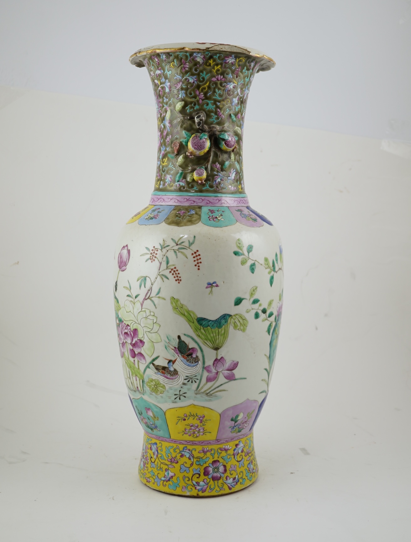 A large Chinese famille rose two-handled vase, mid 19th century, one side painted with ducks and insects amid lotus, the reverse with blackbirds amid blossoming branches, between a band of lotus petals of alternating colour, the neck applied with a pair of pomegranate shaped handles, on an olive-brown ground, painted with leaves and scrolling tendrils, the foot with lotus flowers, leaves and scrolling tendrils on a yellow ground, 60.5cm high, sections of rim lacking,