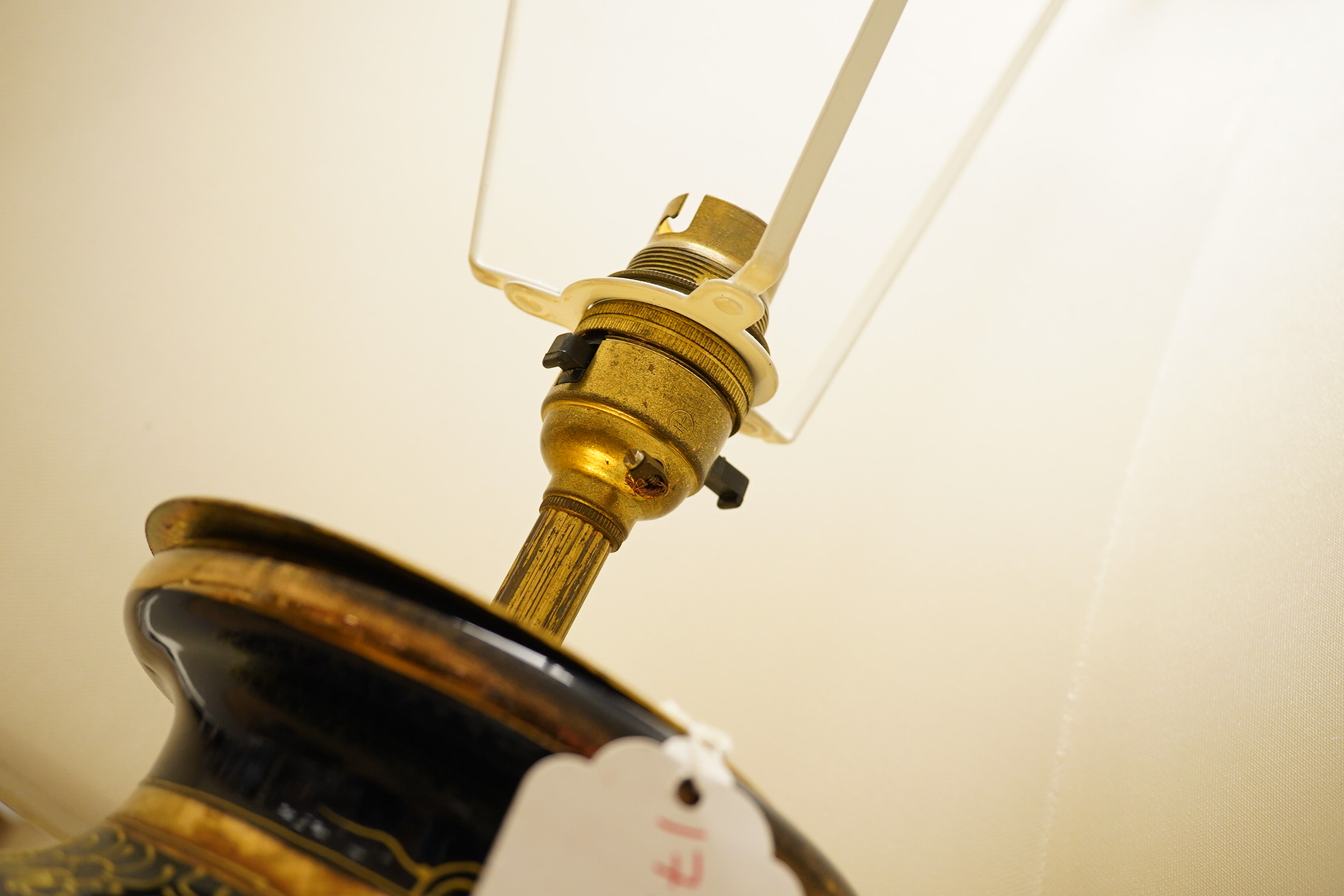 Lot 1494 , A pair of modern Japanese pottery table lamps, with cream shades, 77cm high including shade. Condition - good