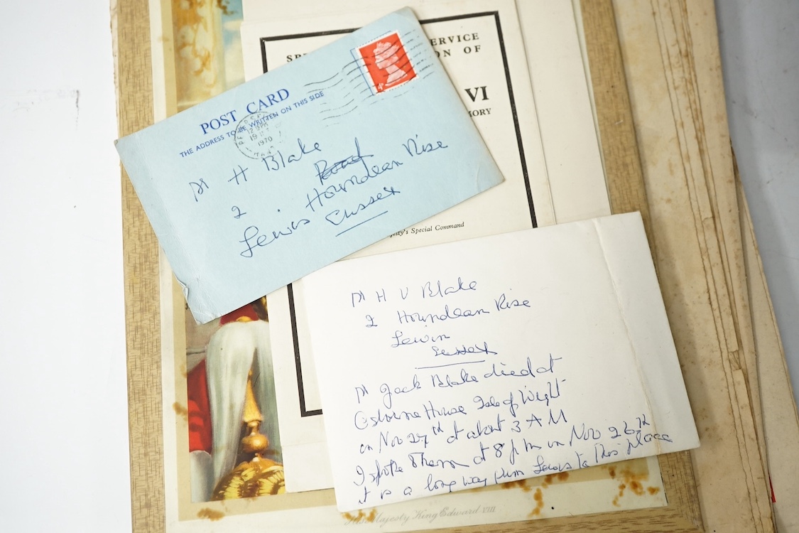 A civilian OBE with ladies bow ribbon, hallmarked for London 1929 in a Garrard’s fitted case, together with a small collection of Royal memorabilia relating to the coronation and death of George VI. Condition - fair, hinges broken on the case of the OBE, general staining and damage to the ephemera.