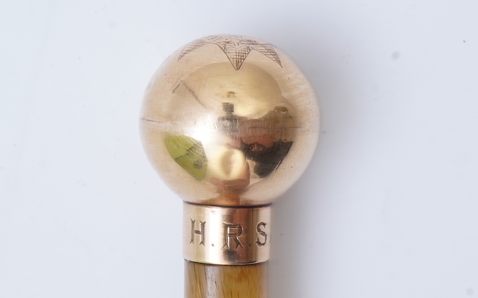 A gold mounted horn riding crop, late 19th century, the tapering horn riding crop with a spherical cap engraved with a medal of the Order of the Garter, inscribed 'BOX from COX 1876', initialled HRS, total length 67cm
