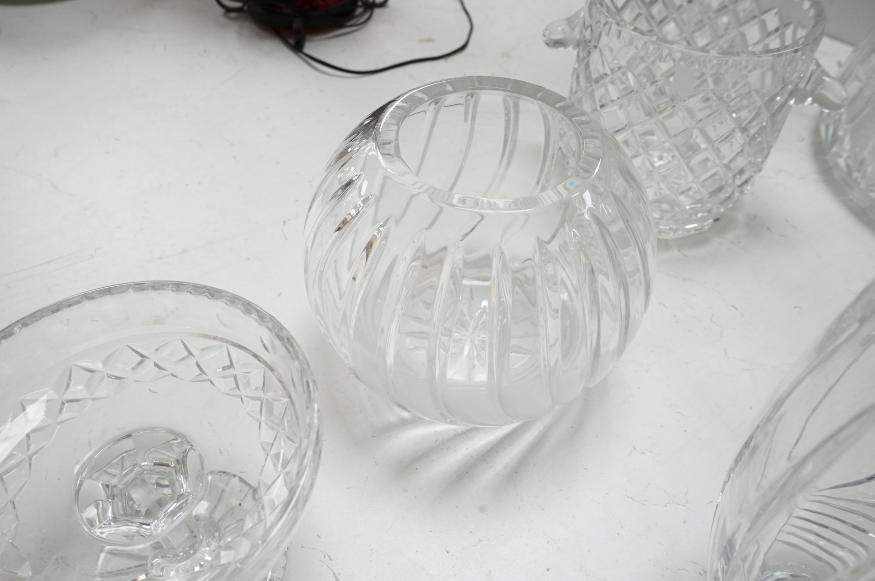 Four heavy cut glass bowl, two ice buckets, cocktail shaker, etc. Tallest vase height 30cm