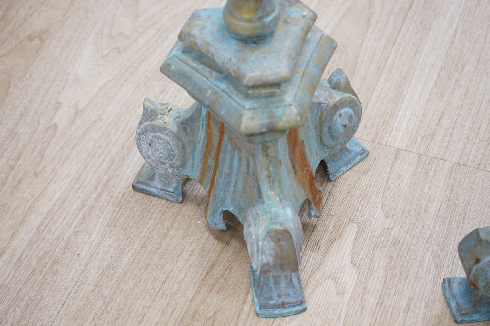 A pair of brass floor standing pricket candlesticks, 110cm high. Condition - both have verdigris and one top plate is cracked.