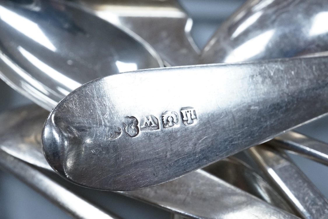 A quantity of assorted mainly 18th and 19th century silver flatware, various patterns, dates and makers, mainly teaspoons but including a pair of George III Old English pattern table spoons, by Hester Bateman, London, 1774, 21.3cm and a set of three 19th century Scottish table spoons, 37.1oz.