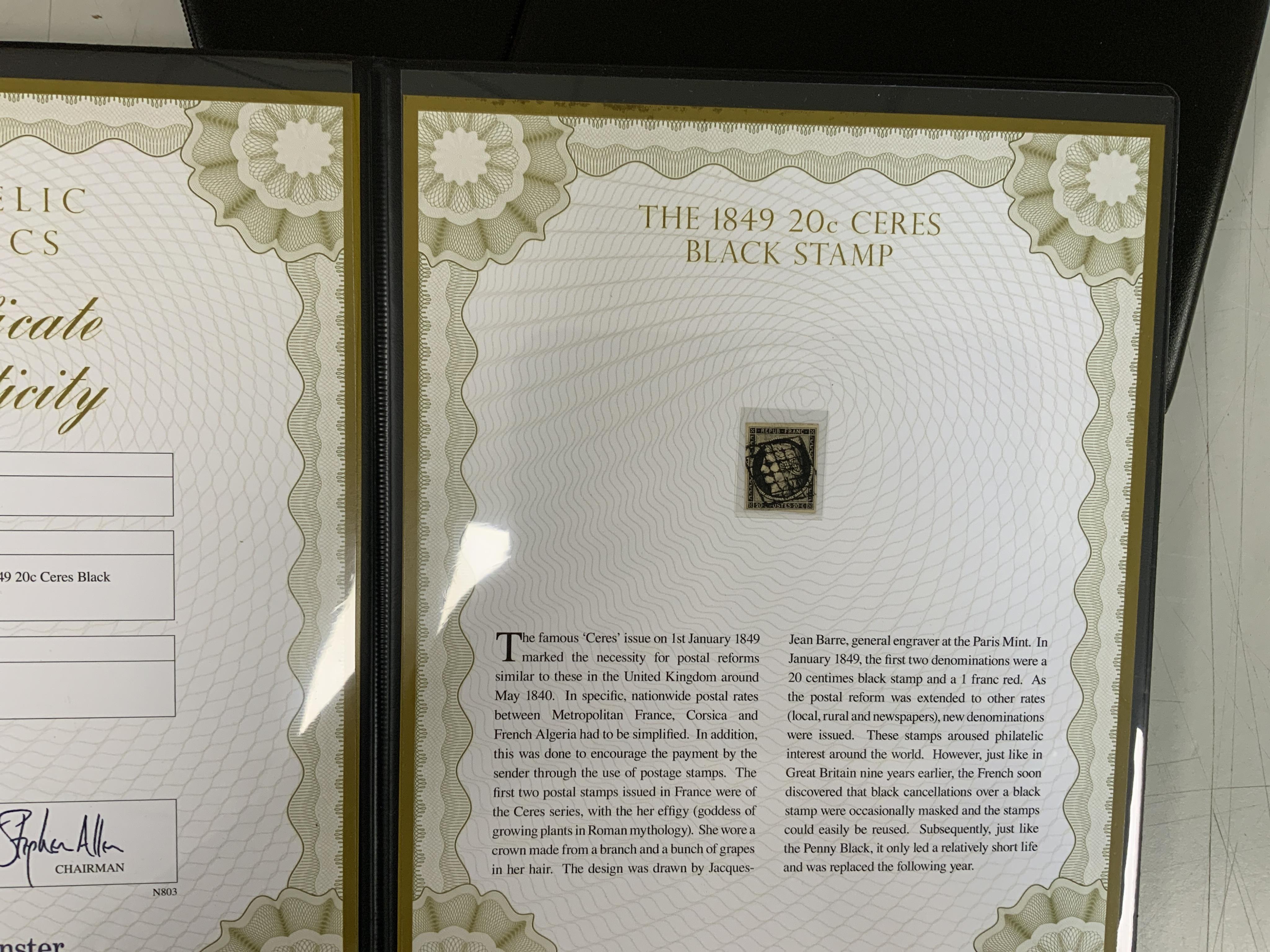 Five presentation folders of stamps issued by the Westminster collection as part of The World’s Most Famous Stamps and Philatelic Classics series including; a USA 1847 letter with 5c stamp, the 3d Beaver Canada stamp, two of the 1849 20c Ceres Black Stamp, and The World’s First Mourning Stamp, all presented with a brief history and certificate of authenticity.
