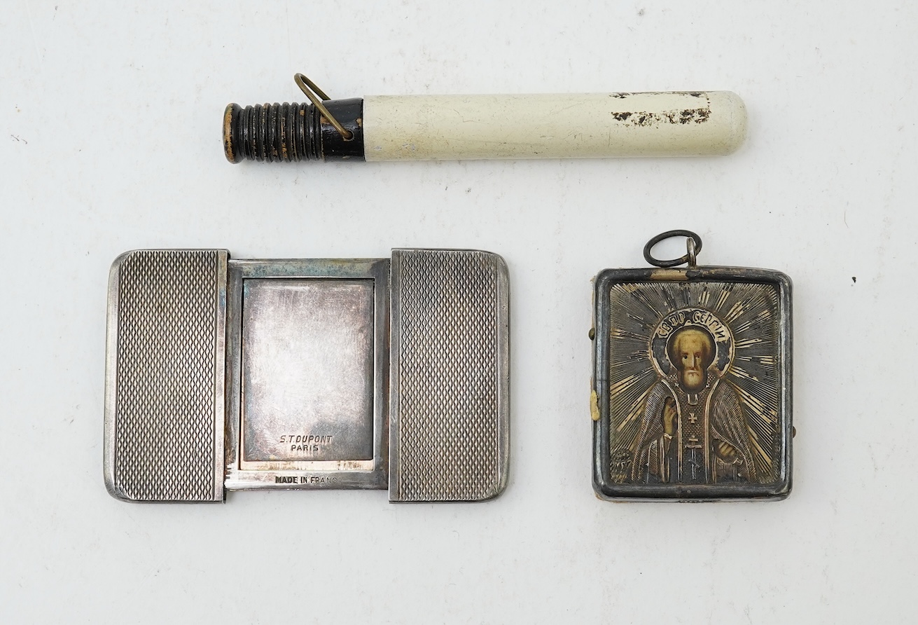 A collection of jewels and accessories including a Russian icon, comprising: a white glass bead rosary; a gilt metal and paste sacred heart motif for wall mounting, length 15.5cm; a gilt metal cube-shaped Nepro alarm clock in leather case; a Russian icon depicting the Madonna and Child, length 13.5 x 11.4; and a smaller icon depicting St Peter, 84 zolotnik mark; a faceted glass handle; a bronze crucifix; a device with a fold-out mechanism by Dupont; a novelty keyring designed as a truncheon inscribed 'Paris'; another designed as an owl with glass eyes; and a steel ball-link chain
