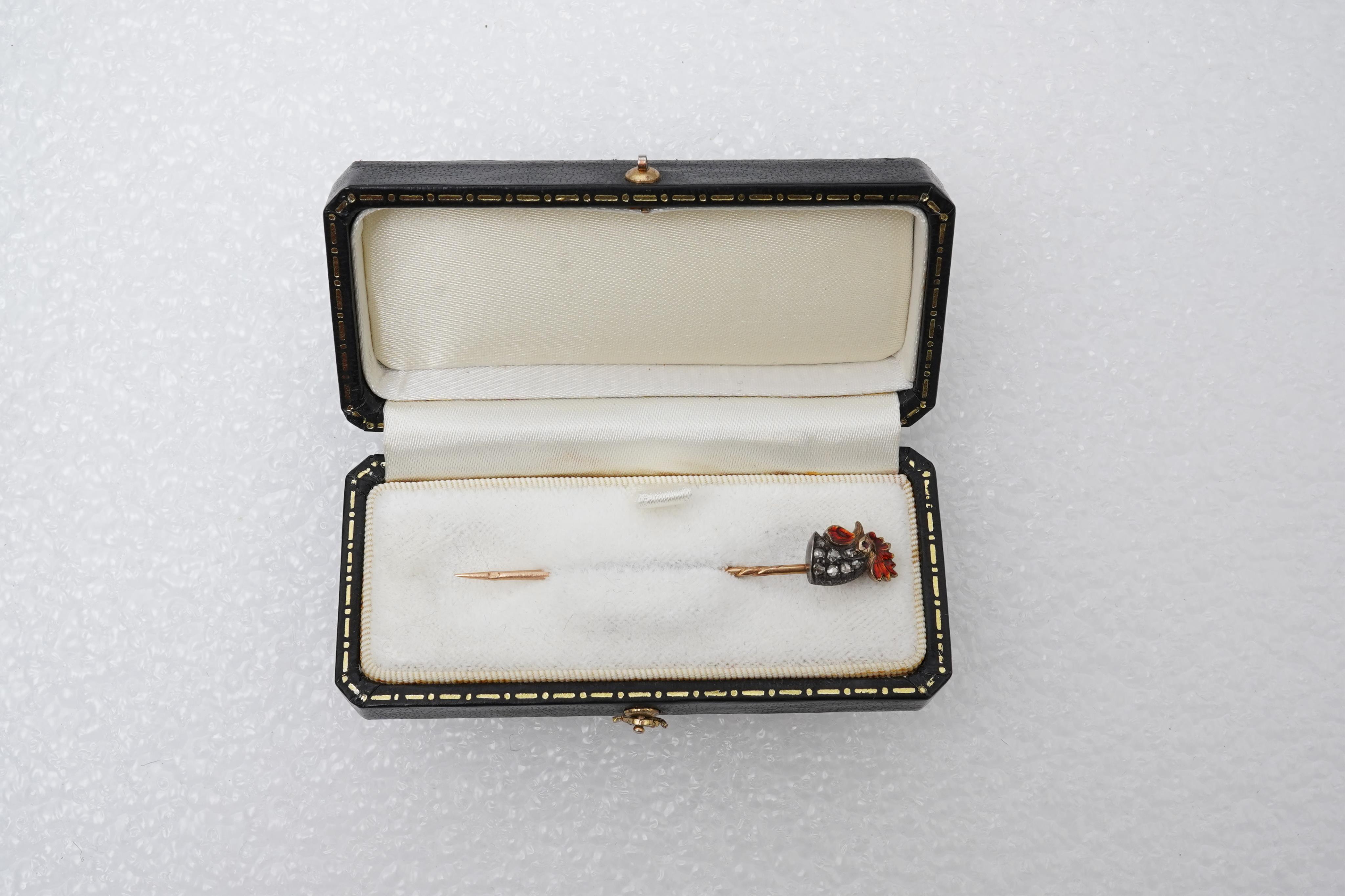 An enamel and diamond stick pin, circa 1900, designed as a cockerel's head, set with rose-cut diamonds and applied with red basse taille enamel, mounted in silver and gold, length 5.5cm