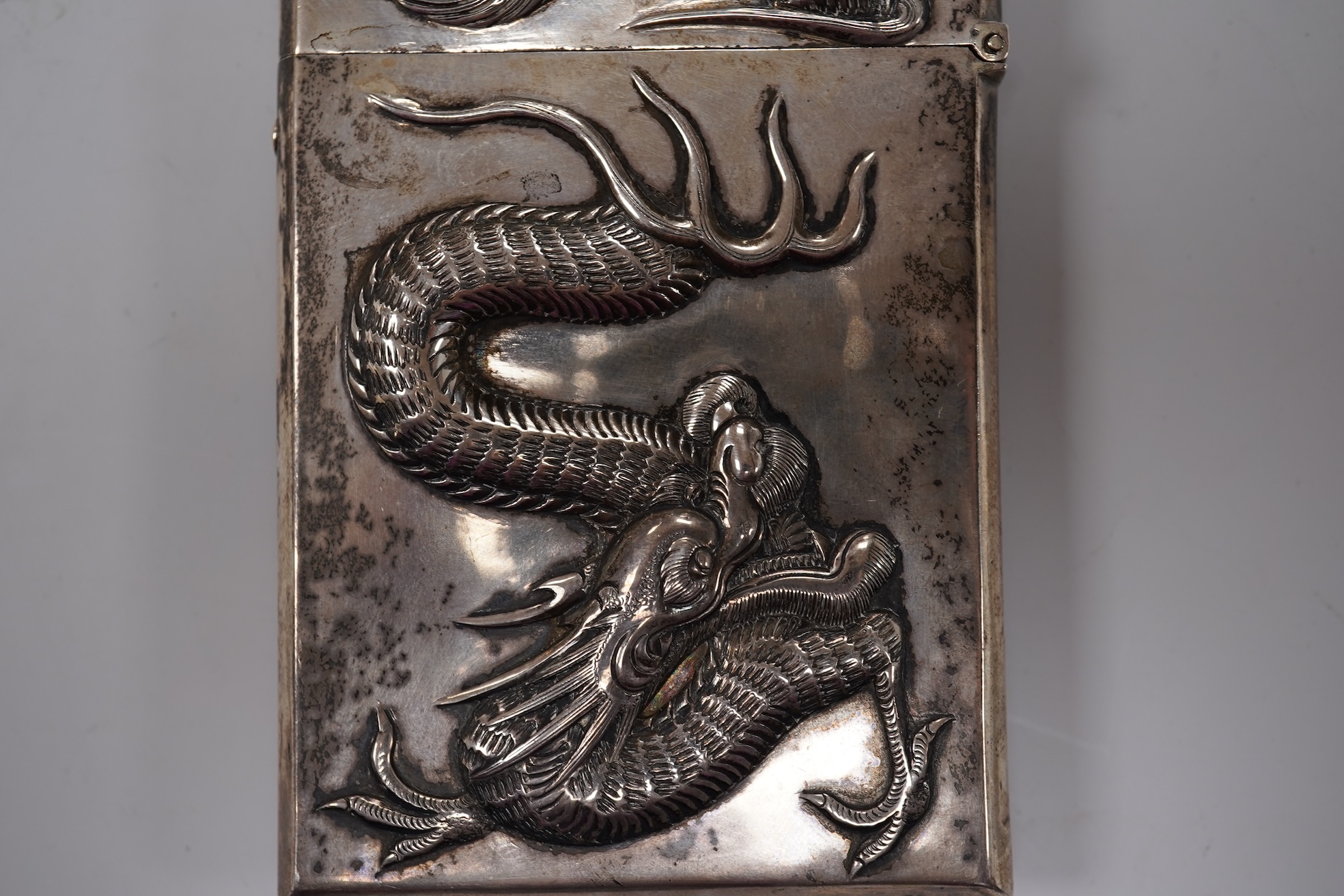 Lot 845 , A late 19th century Chinese Export white metal card case, by Cum Shing, Canton, embossed with a dragon and applied shield shaped panel engraved with monogram, 90mm, 85 grams.