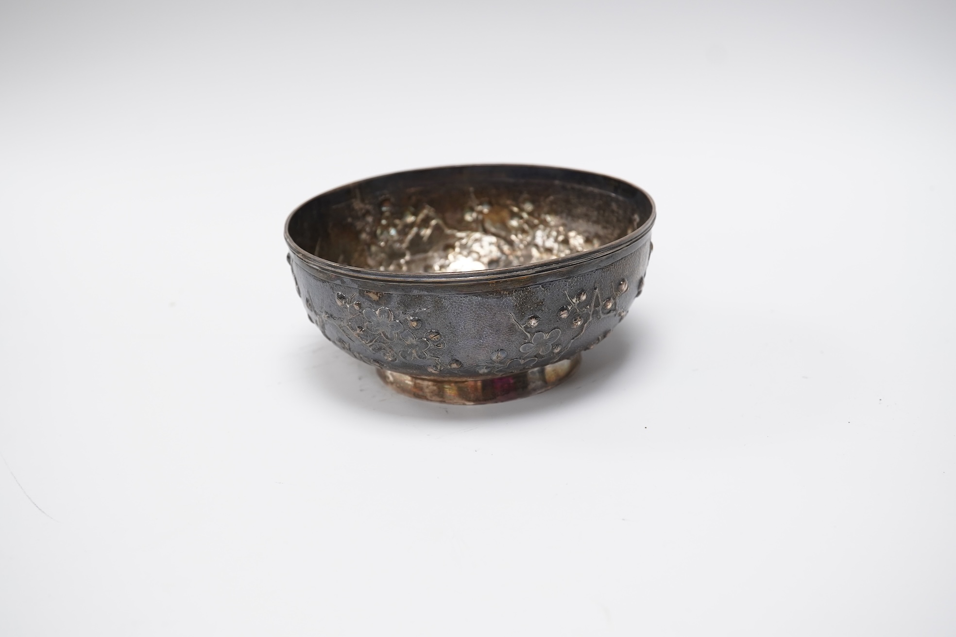 A late 19th/early 20th century Chinese Export white metal bowl, by Wang Hing, Hong Kong, embossed with blossoming prunus branches, diameter 10.6cm, 113 grams.