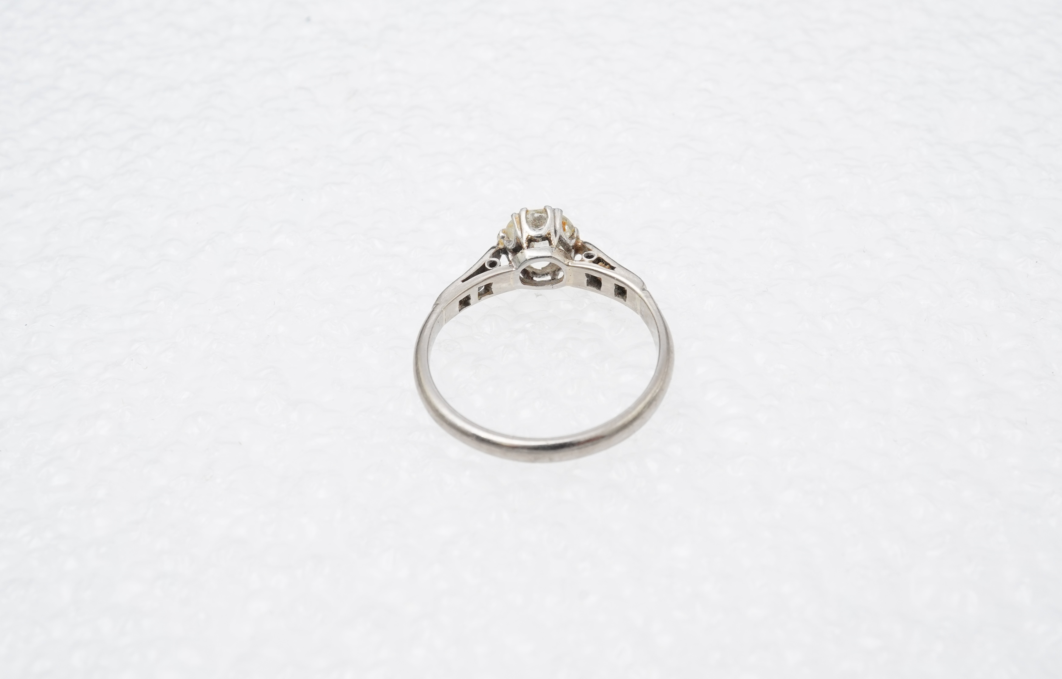 Central diamond approximately J/K colour, VS clarity. Mount in good condition, shank likely replaced. Not marked, mounted in white gold or platinum. Gross weight approximately 3 grams.