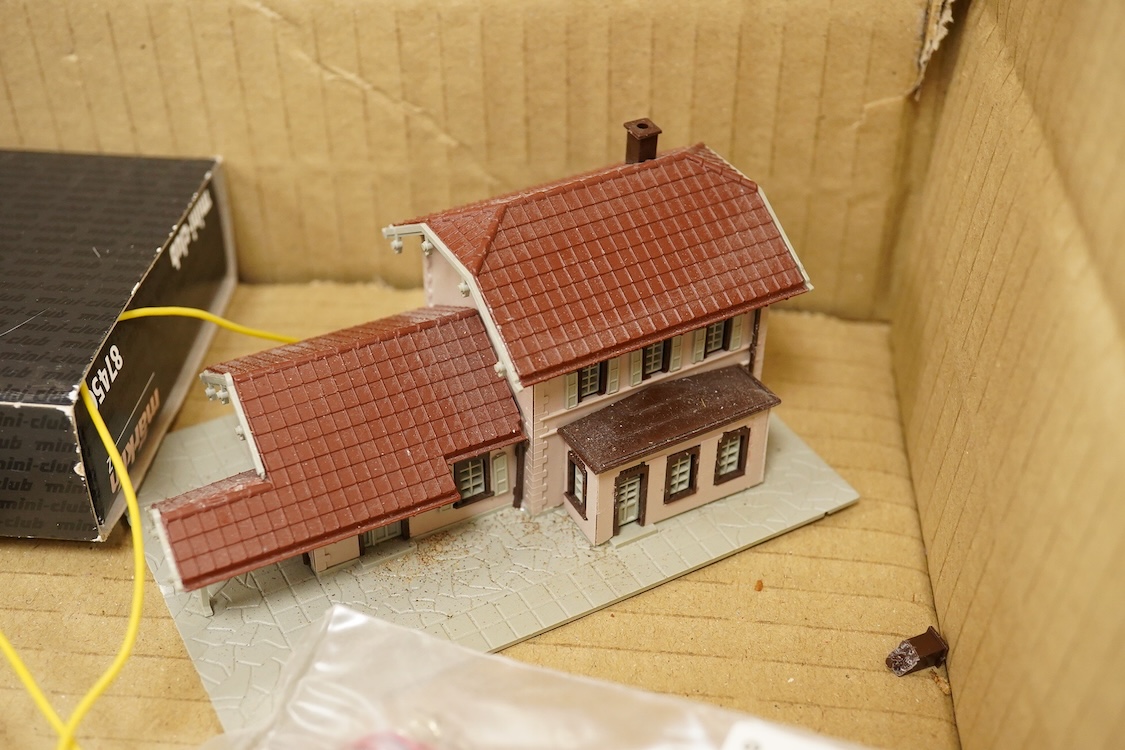 A Marklin Z gauge railway collection, Swiss railway from set 81852, including an SBB CFF FFS Bo-Bo pantograph electric locomotive, together with a boxed Mini-club unpowered 4-car set (87456), three freight wagons, a bridge, a station building, controller, and a small quantity of track lengths, etc.