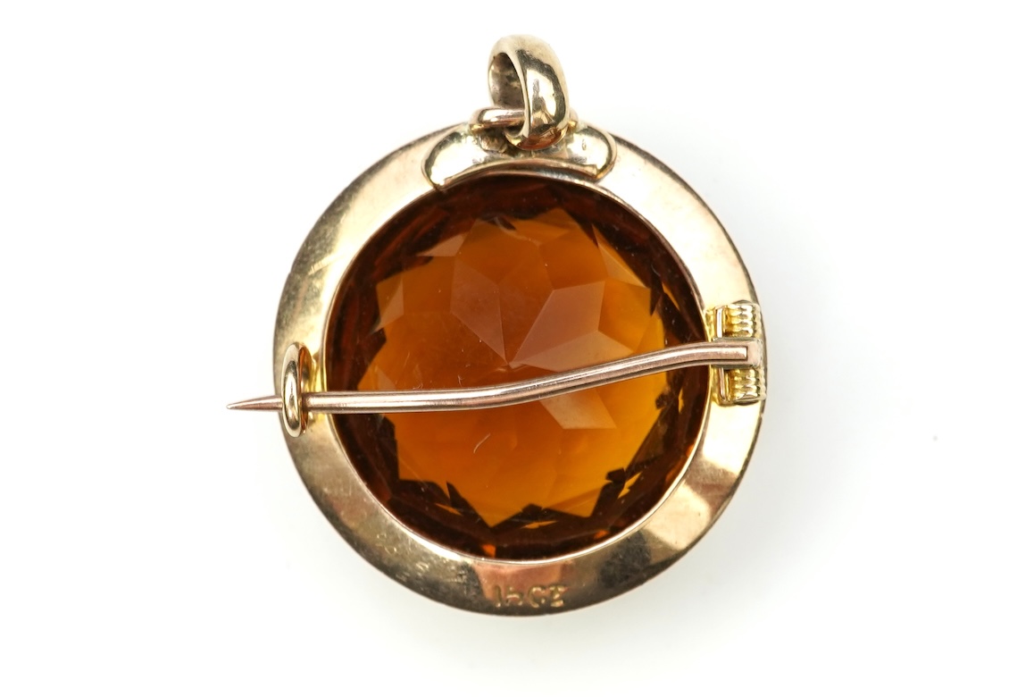 An Edwardian citrine and pearl brooch/pendant, early 20th century, set with a circular-cut citrine within a border of split pearls, mounted in gold, 2.4cm diameter, stamped 15CT, gross weight 6.5 grams, pearls untested