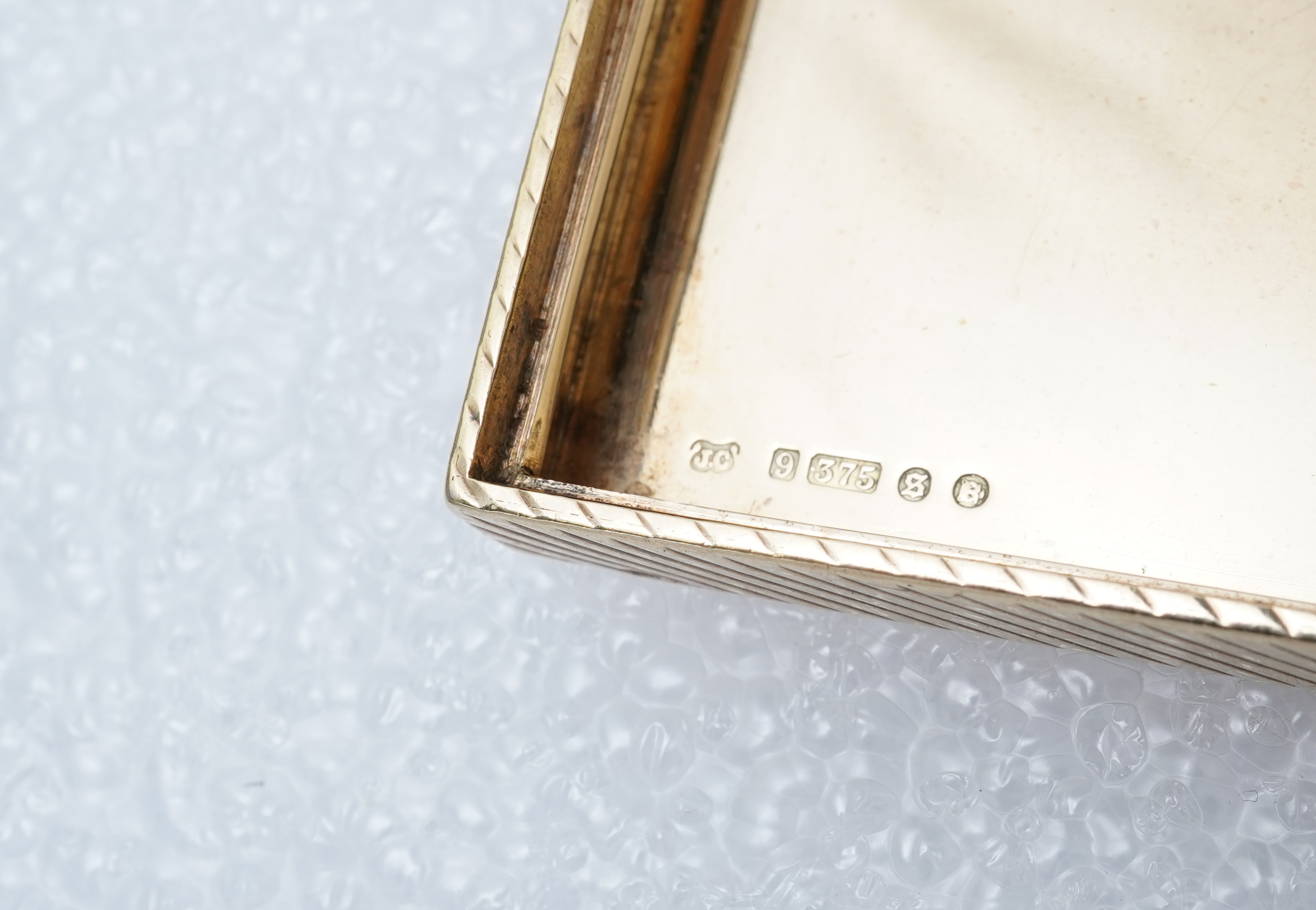 Cartier, a 9ct gold cigarette case, London, circa 1933, of rectangular outline with fluted engraving, opening via a concealed push piece to reveal a plain interior, measuring 10.8 x 7.9 x 0.9cm, signed Cartier London, numbered 2023, British hallmarks for 9ct gold, sponsor's mark JC for Cartier London, date letter for 1933, gross weight approximately 158 grams