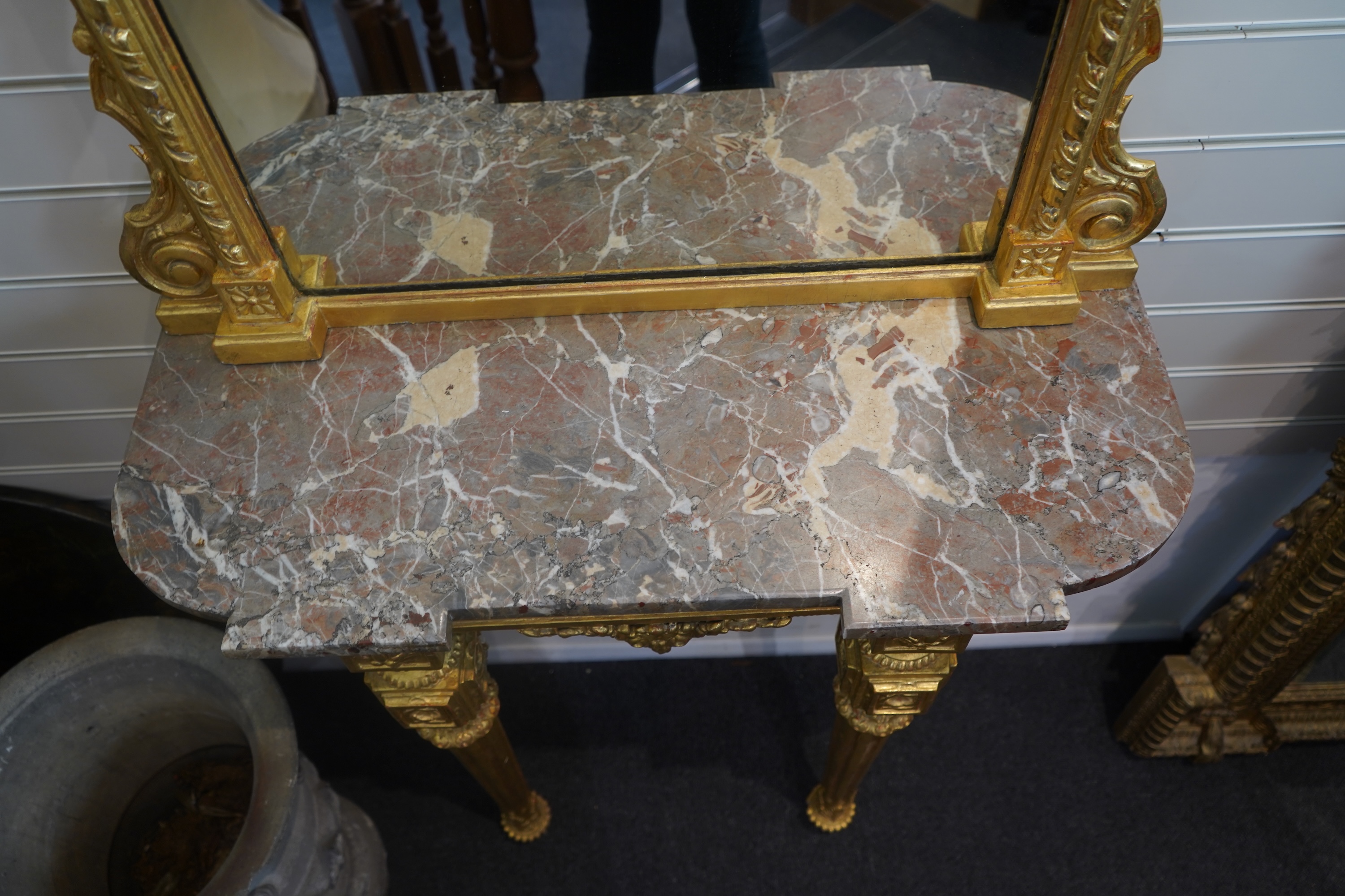 Lot 355 , A pair of Louis XVI style giltwood and composition marble topped pier tables and mirrors