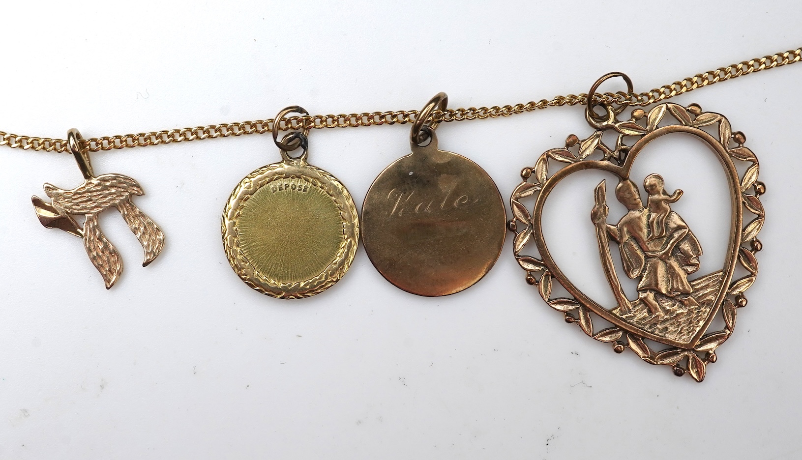 A gold necklace and pair of earrings, the gold curb chain suspending four pendants including a heart-shaped St Christopher, a St Christopher medallion, a '+ qu'hier - que demains' medallion pendant set with a rose-cut diamond and red pastes, and a Hebrew letter, chain with British import hallmarks, Hebrew pendant stamped 14K, remaining pendants unmarked, combined gross weight 14 grams; and a pair of gold drop earrings, length 4.3cm each, hook fittings, stamped 750, combined gross weight 4 grams