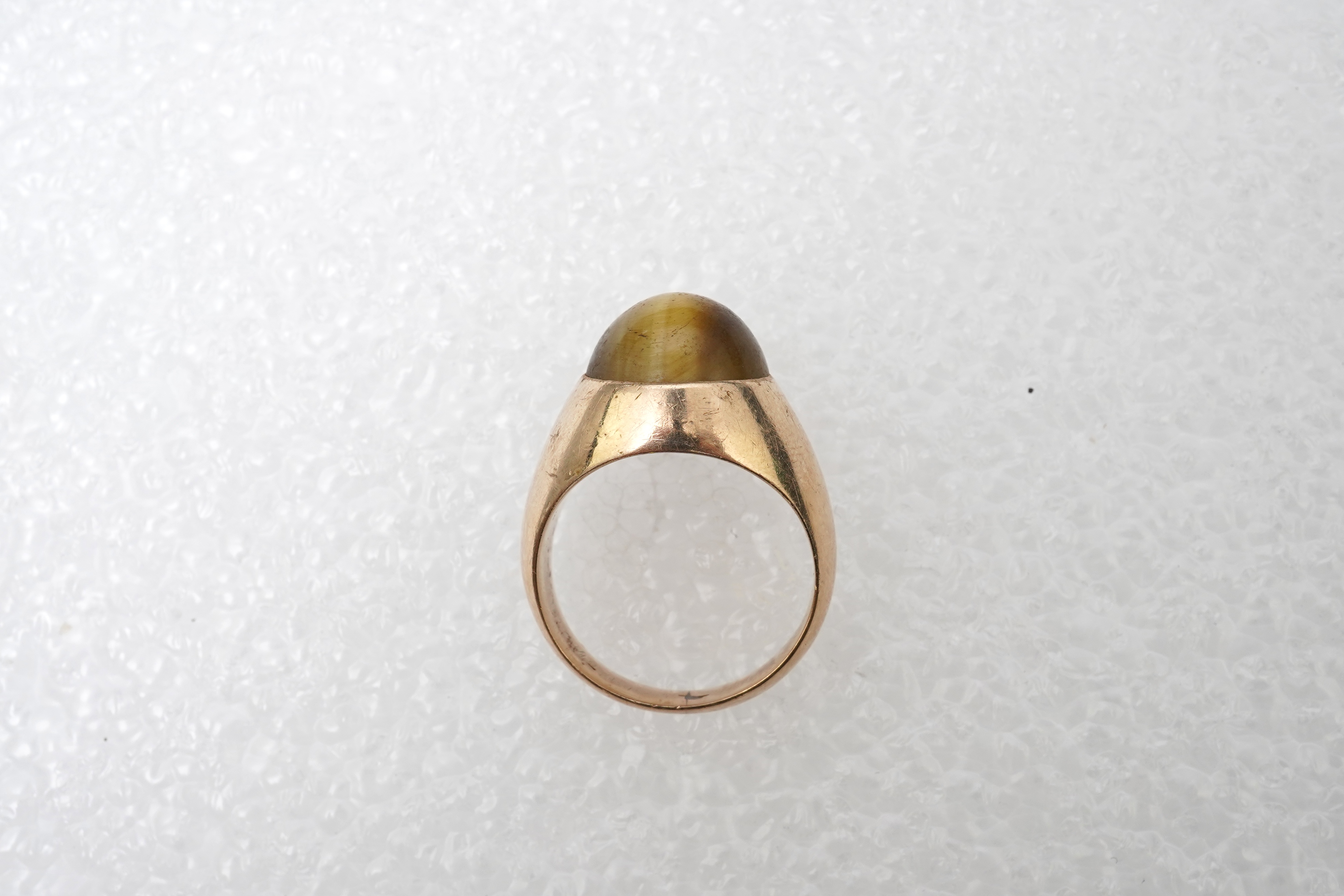 A tiger's eye dress ring, 1970s, collet-set with a cabochon cat's eye, to a plain gold mount, size O1/2, stamped 14K, gross weight approximately 9.5 grams