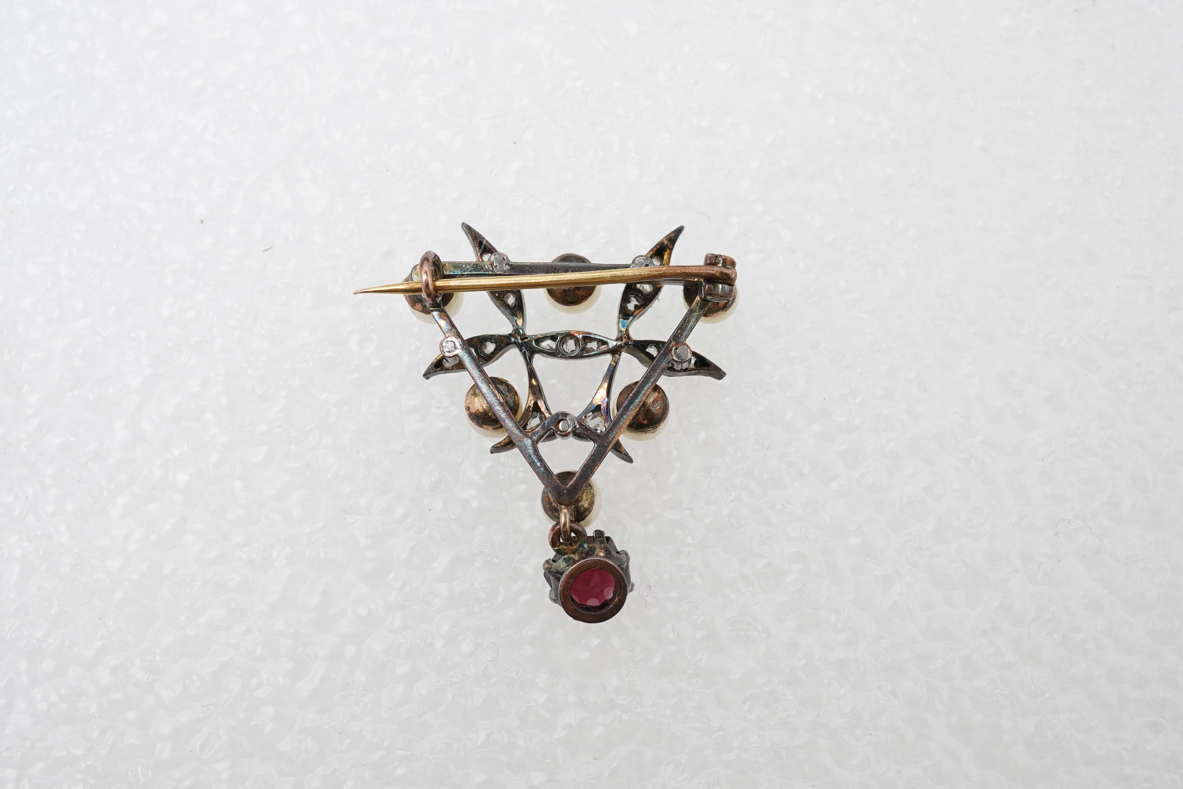 A pearl, garnet and diamond brooch
