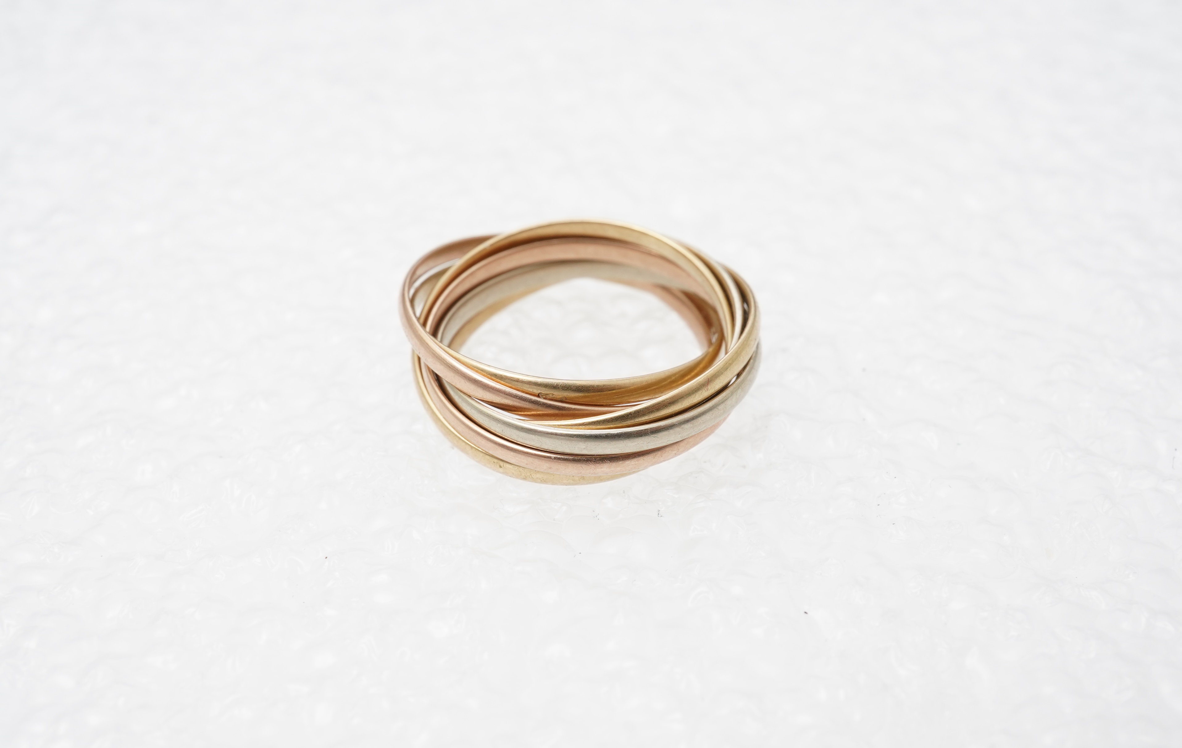 A Russian-style gold wedding band, composed of seven bands of yellow, rose and white gold, size K, stamped Cartier, French assay marks for 18ct gold to yellow bands