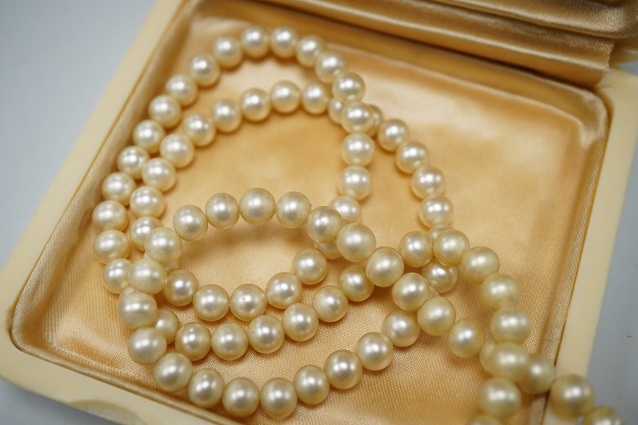 Two coral necklaces and a group of costume jewels, comprising: two coral bead necklaces, each with a gold clasp, combined gross weight approximately 35 grams; together with a simulant pearl necklace and pair of earrings by Ciro; a gilt metal watch pendant by Sonique; and a long black and colourless bead necklace