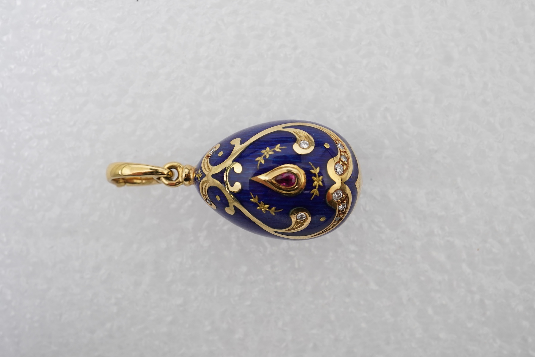 Fabergé, a modern gold, enamel and diamond pendant, designed as an egg, applied with blue guilloché enamel decorated with gold scrollwork in reserve, set with brilliant-cut diamonds and a pear-shaped ruby, length 4cm including bail, signed Fabergé, limited edition number 7/200, stamped 750, gross weight 17 grams